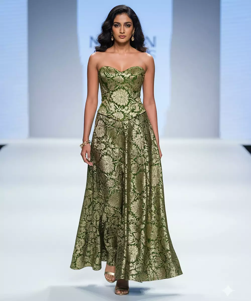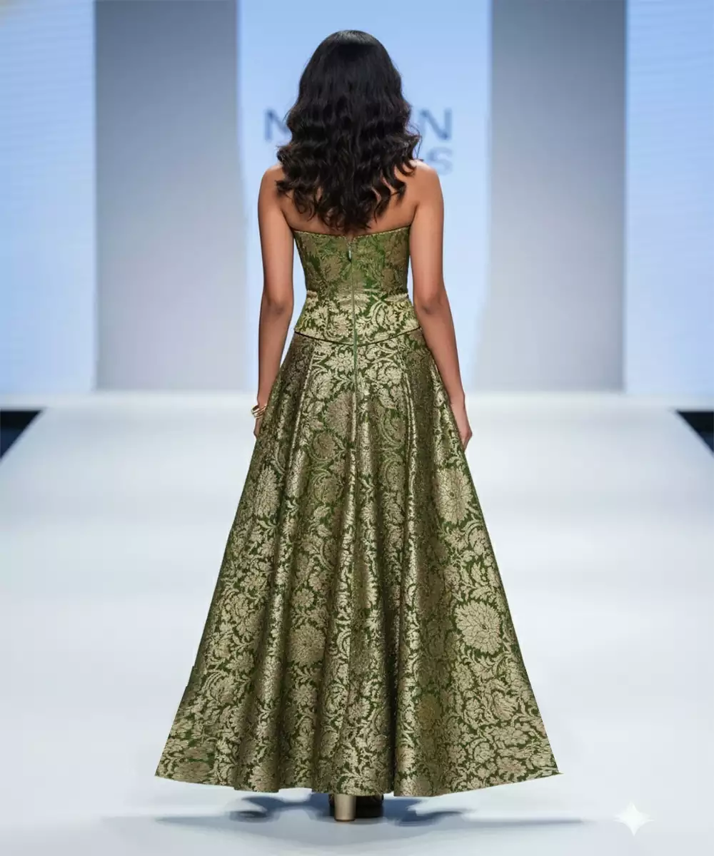 This Green Embroidered Brocade Co Ord Set Showcases Regal Charm With Its Rich Woven Texture And Elegant Detailing. The Brocade Fabric Adds Structure And Depth, While Embroidery Enhances Its Festive Appeal. Ideal For Weddings, Celebrations, And Traditional Occasions.