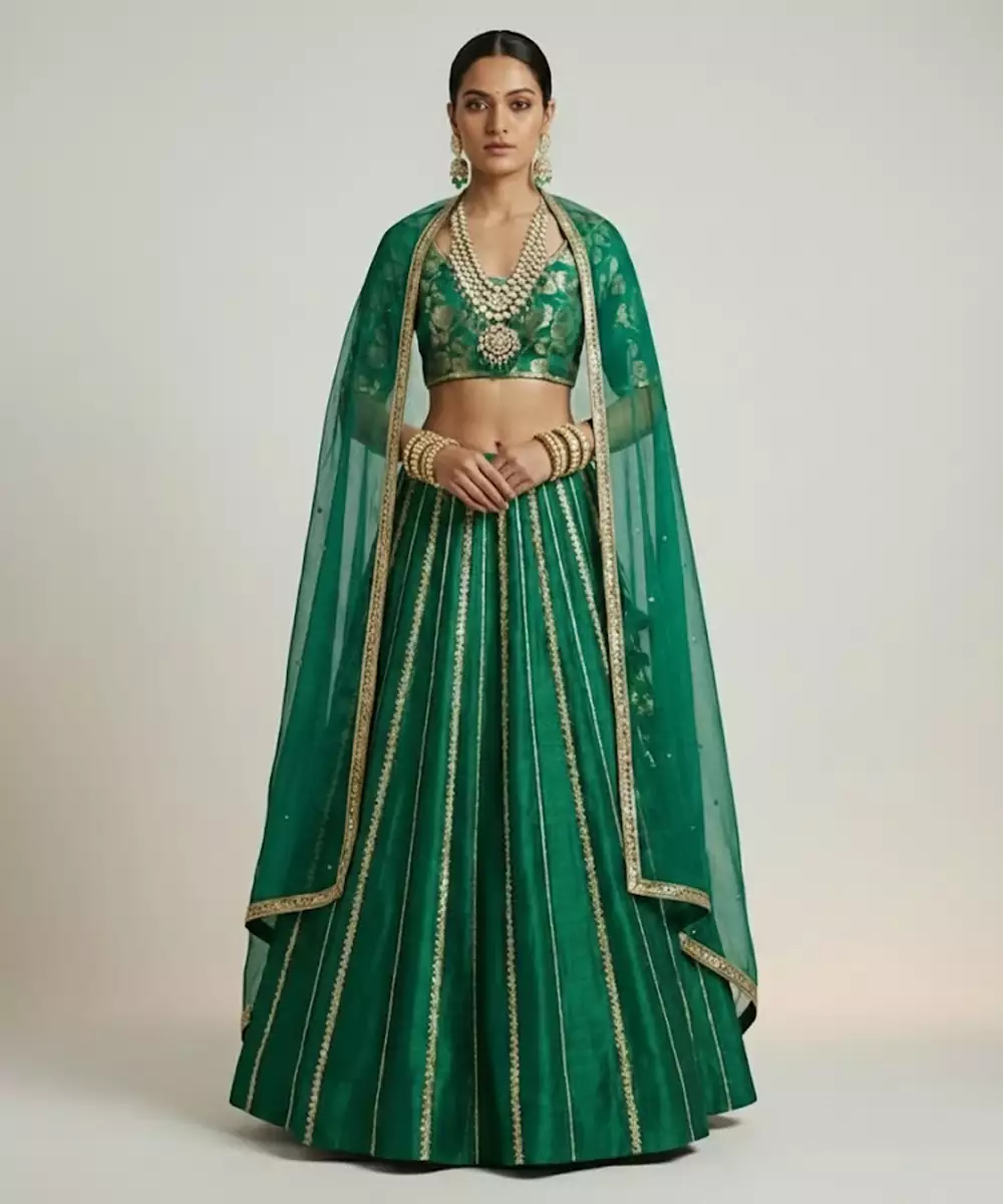 Rich Green Embroidered Brocade Lehenga Set Crafted In A Luxurious, Textured Fabric With A Royal Finish. Intricate Embroidery Enhances Its Traditional Elegance, While The Flared Silhouette Adds Grace And Grandeur. Perfect For Weddings, Festive Celebrations, Receptions, And Special Traditional Occasions.