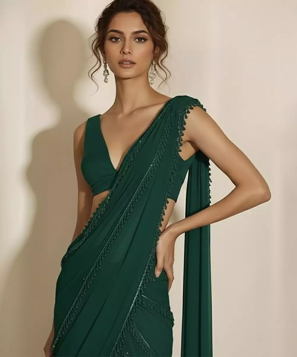 This Green Embroidered Georgette Draped Saree Set Offers A Perfect Blend Of Elegance And Modern Convenience. The Flowy Georgette Fabric Drapes Beautifully, While Intricate Embroidery Enhances Its Festive Charm. Designed For Effortless Wear, It Is Ideal For Weddings, Receptions, And Special Occasions With A Refined Ethnic Appeal.