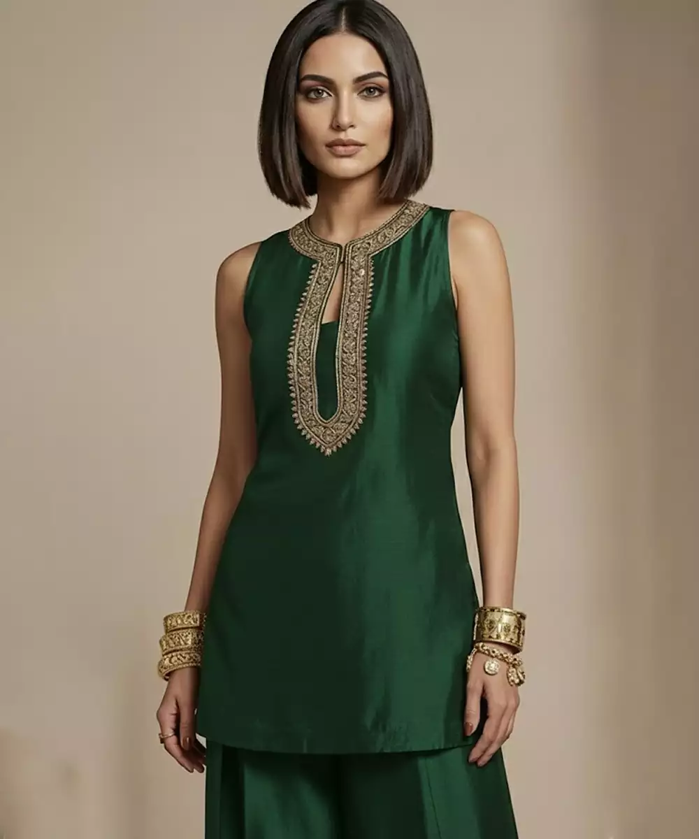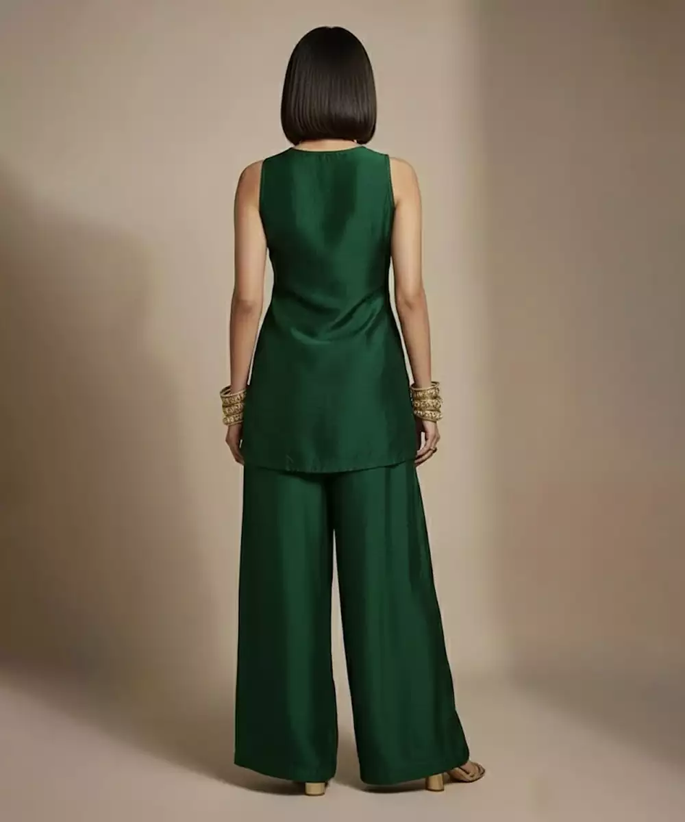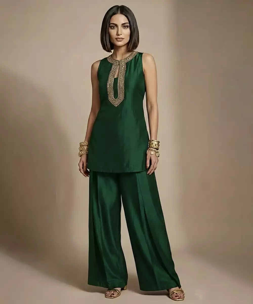 This Green Raw Silk Co Ord Set Is Enhanced With Elegant Embroidery That Highlights Its Rich, Earthy Tone. The Natural Texture And Soft Sheen Create A Refined Appearance, Making It Ideal For Festive Lunches, Cultural Gatherings, And Contemporary Ethnic Celebrations.