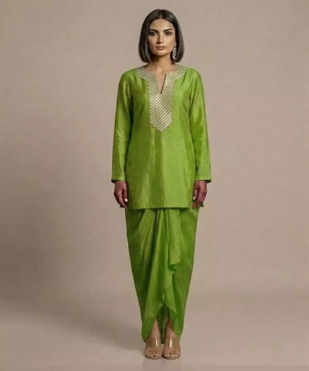 "This Green Satin Silk Kurta Is Adorned With Intricate Embroidery, Creating A Perfect Balance Of Elegance And Richness. The Lustrous Fabric Offers A Smooth, Graceful Drape While Enhancing The Vibrant Hue. Ideal For Festive Occasions, Weddings, And Cultural Celebrations, It Delivers Timeless Charm With A Refined Traditional Appeal.