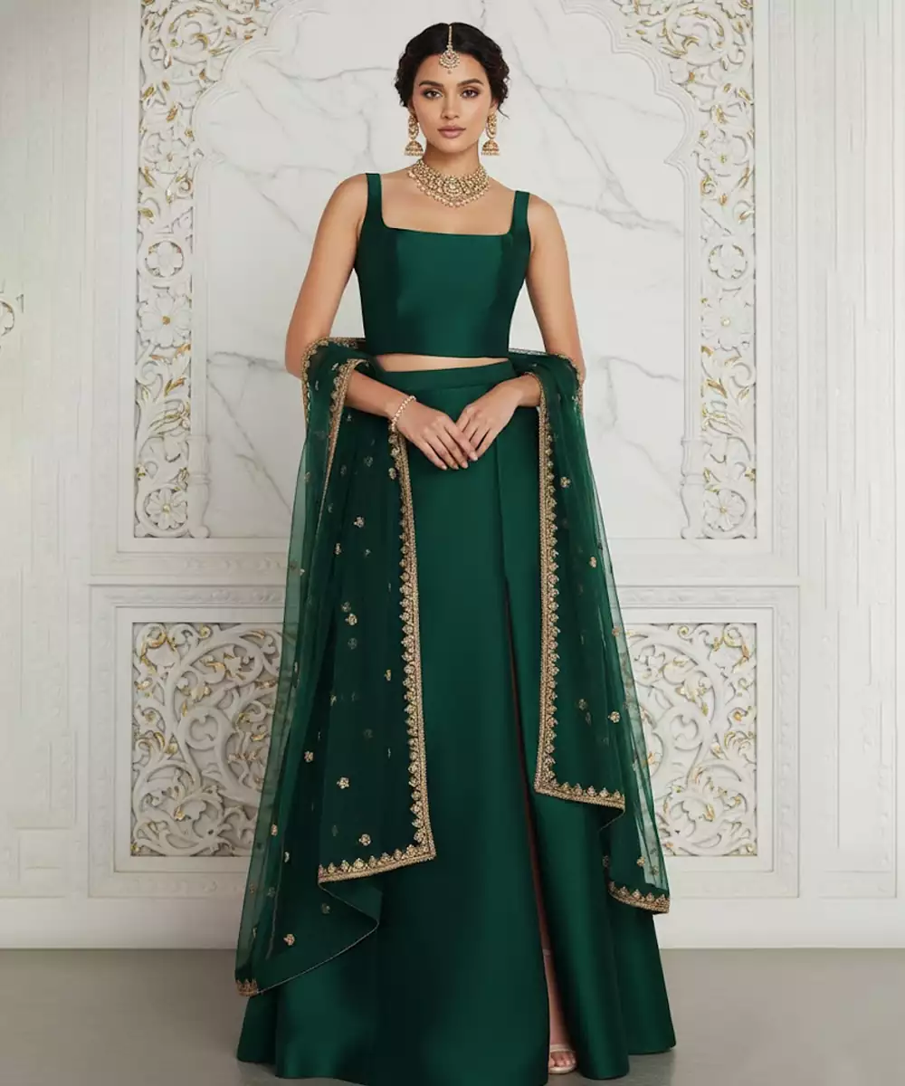 Rich Silk And Detailed Embroidery Come Together In This Elegant Green Lehenga Set. The Luxurious Fabric Adds Depth And Shine, Making It Ideal For Weddings And Grand Festivities. A Classic Ethnic Ensemble That Combines Traditional Richness With A Graceful, Flattering Silhouette.