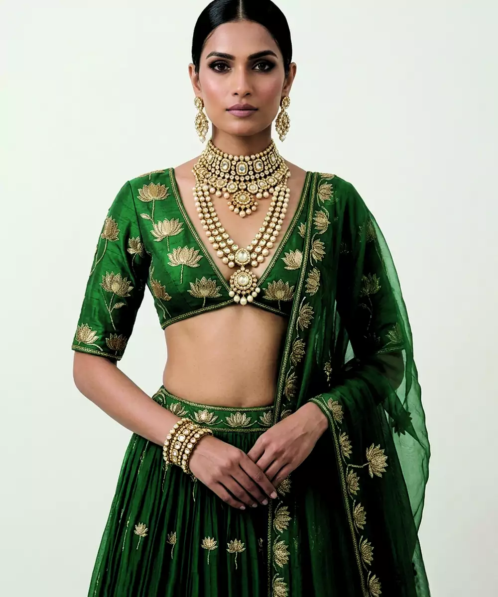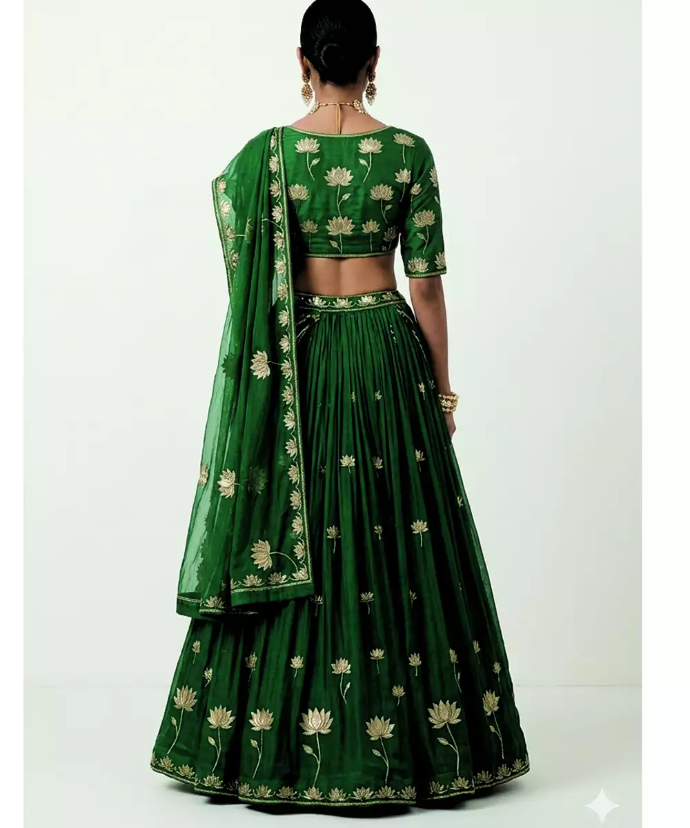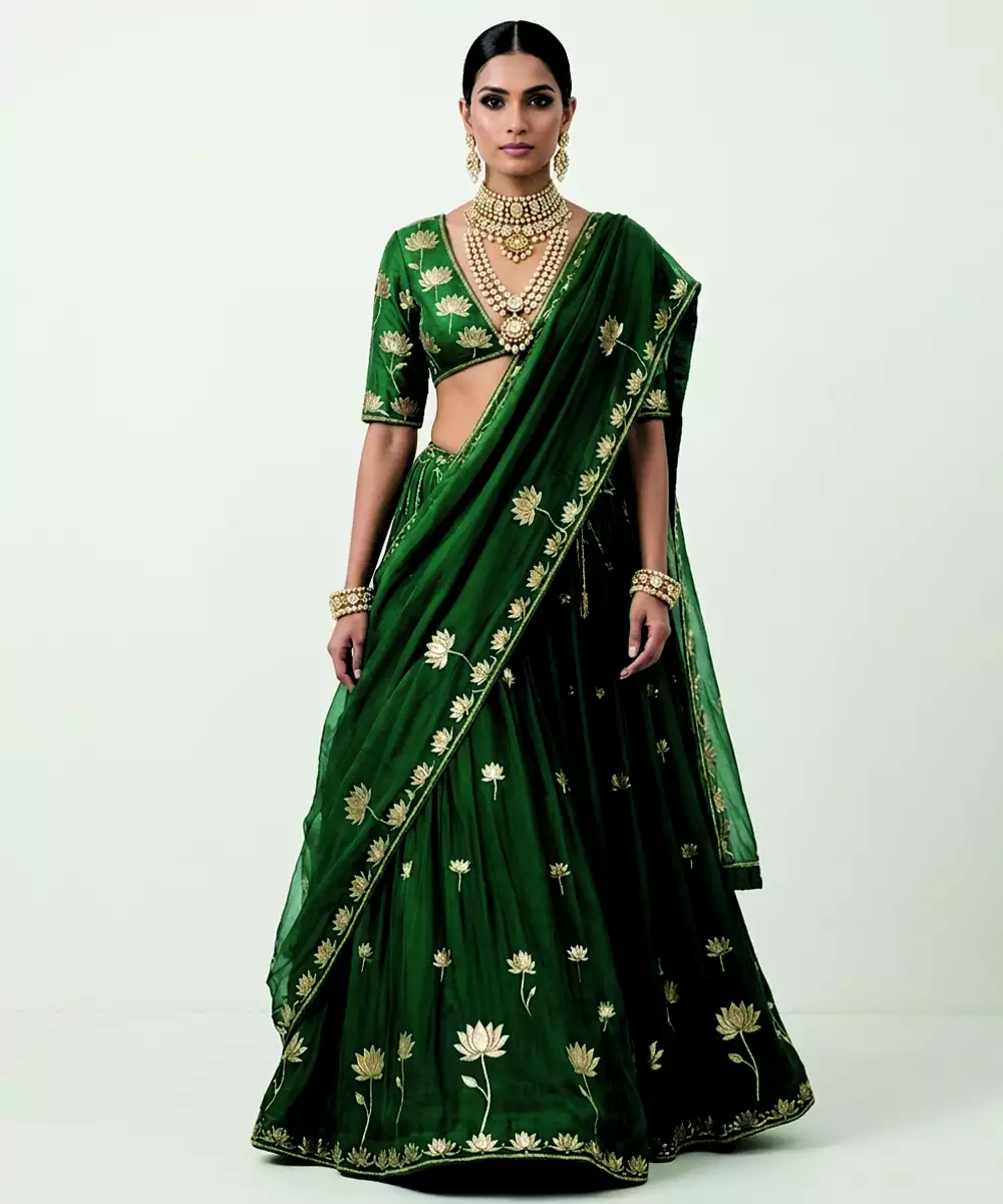 This Green Silk Lehenga Set Showcases Exquisite Embroidery That Highlights Its Regal Appeal. The Luxurious Silk Fabric Provides A Smooth Finish And Elegant Flow. Ideal For Weddings And Grand Occasions, It Features A Beautifully Crafted Blouse And Dupatta, Making It A Sophisticated Choice For Those Seeking Classic Yet Striking Attire.