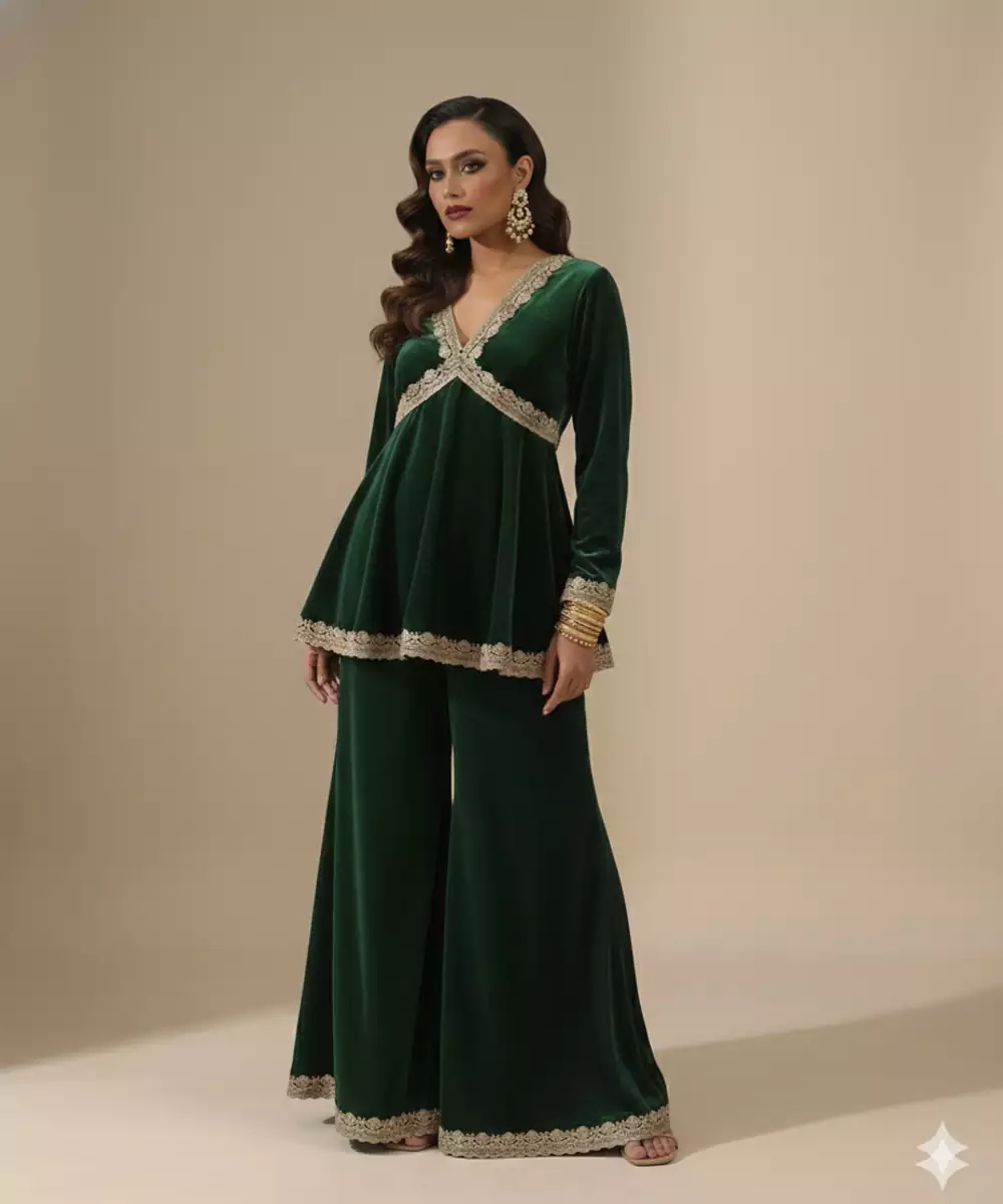 Green Embroidered Velvet Kurta Set Crafted With A Rich, Plush Texture And Luxurious Appeal. Enhanced With Intricate Embroidery That Adds Elegance And Sophistication. Designed For Comfort And Style, This Set Is Perfect For Festive Occasions, Weddings, And Evening Celebrations, Beautifully Blending Traditional Charm With A Regal, Contemporary Touch.