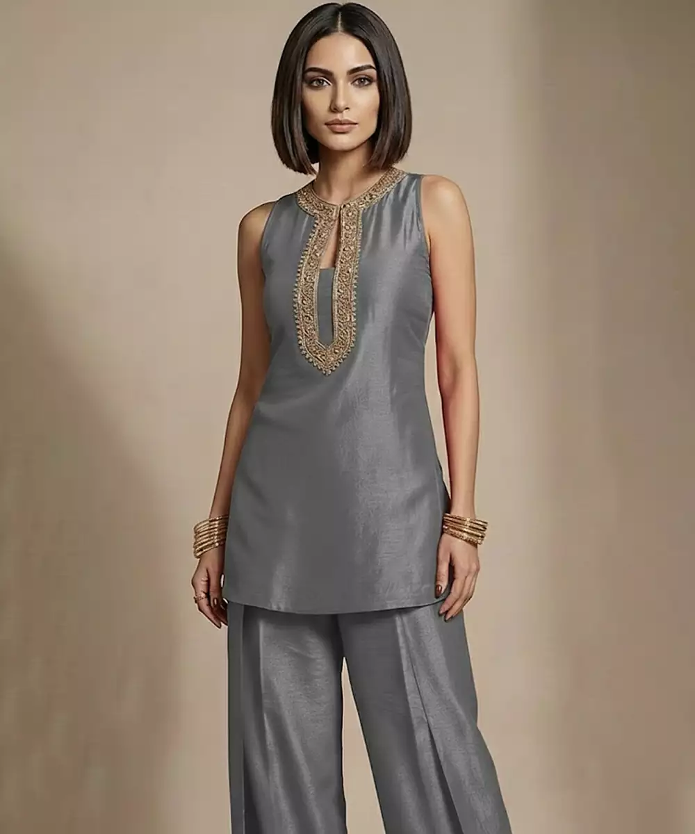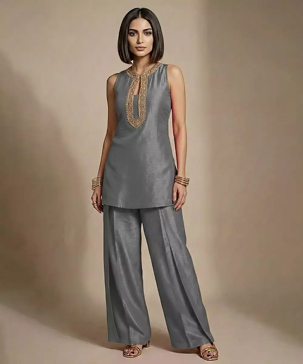 This Grey Raw Silk Co Ord Set Is Elevated With Fine Embroidery That Adds Texture And Sophistication. The Balanced Tone And Luxurious Fabric Make It A Versatile Choice For Festive Lunches, Office Celebrations, And Cultural Events, Offering Comfort Without Compromising On Ethnic Elegance.