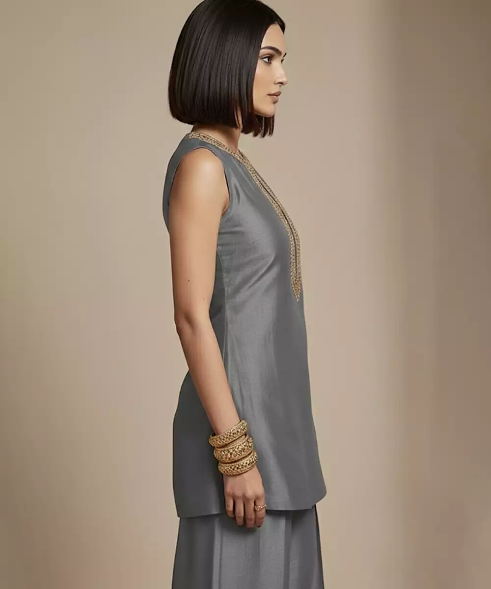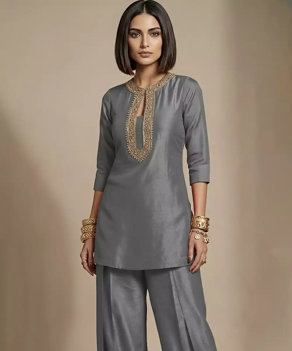 A Refined Grey Co Ord Set In Premium Raw Silk, Accented With Graceful Embroidery For Subtle Glamour. Its Neutral Shade Pairs Beautifully With Statement Jewelry, Making It Suitable For Festive Wear And Special Occasions Where Understated Style Meets Traditional Craftsmanship.