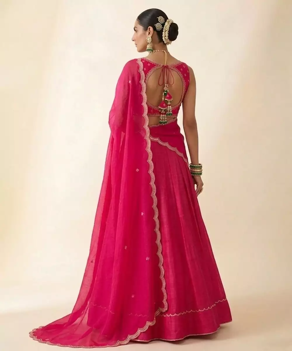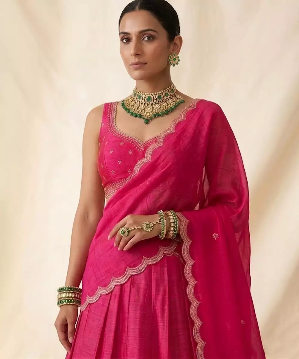 Bold And Eye Catching, This Hot Pink Raw Silk Lehenga Set Features Intricate Embroidery That Enhances Its Festive Allure. The Rich Fabric Provides A Structured Yet Comfortable Fit. Ideal For Vibrant Celebrations, It Includes A Coordinated Blouse And Dupatta, Making It A Standout Choice For Those Who Love Striking Traditional Fashion.