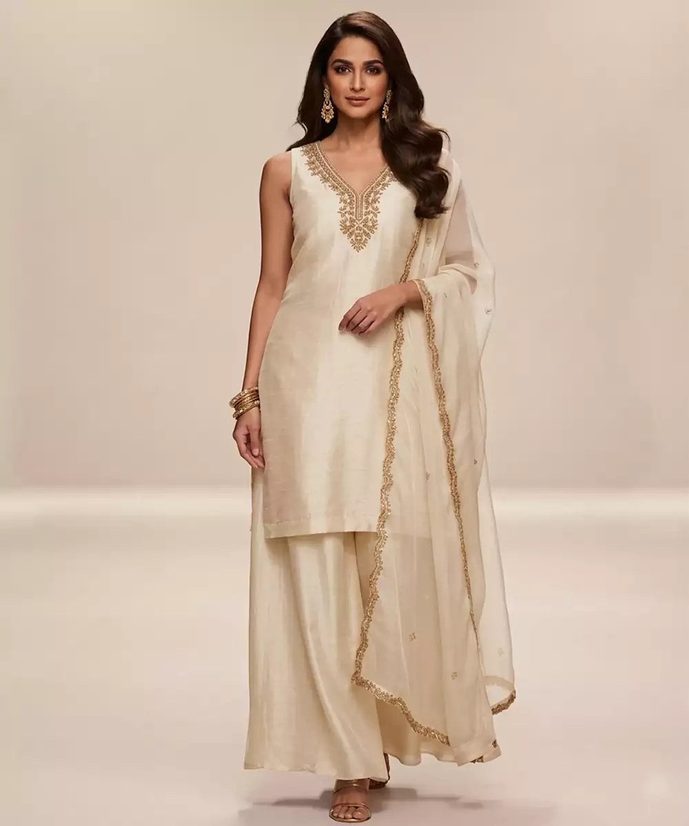 This Ivory Modal Silk Kurta Set Features Fine Embroidery That Enhances Its Subtle And Sophisticated Appeal. The Smooth Fabric Offers Comfort And Elegance, While The Silhouette Ensures A Graceful Fit. Perfect For Festive Gatherings, It Pairs Beautifully With Delicate Accessories For A Timeless Look.