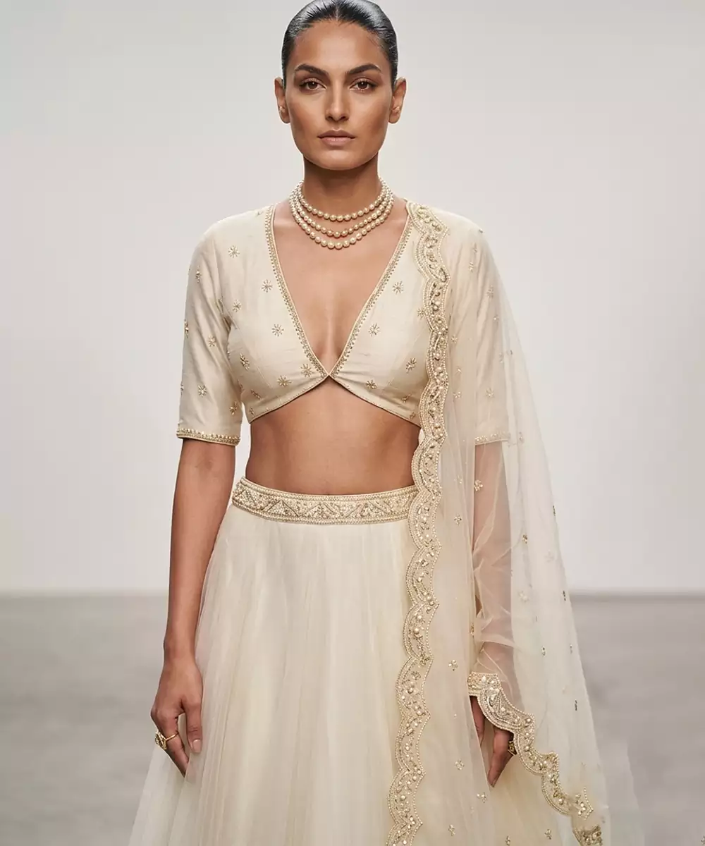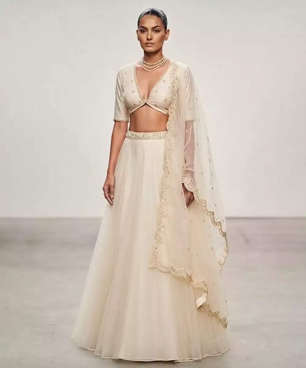 This Ivory Organza Lehenga Set Features Fine Embroidery That Enhances Its Subtle Sophistication. The Lightweight Fabric Drapes Beautifully, Creating An Elegant Silhouette. Perfect For Celebrations, It Pairs Beautifully With Delicate Accessories For A Timeless And Refined Appearance.