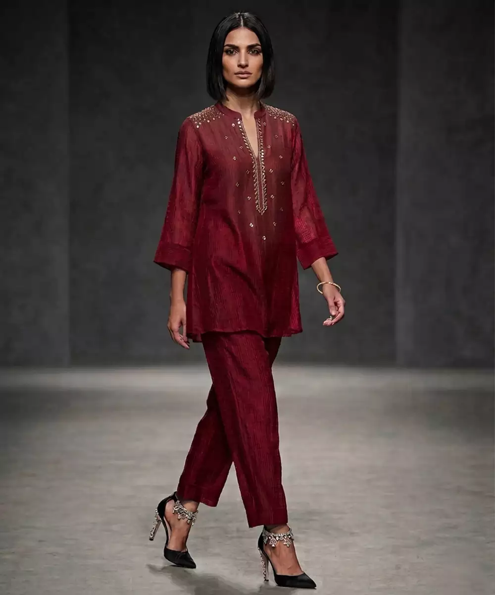 This Maroon Lurex Kurta Set Showcases Elegant Embroidery With A Subtle Shimmer That Enhances Its Festive Charm. The Lightweight Fabric Offers Comfort And Style, While The Silhouette Ensures A Flattering Fit. Ideal For Celebrations, It Pairs Beautifully With Statement Accessories For A Refined Look.