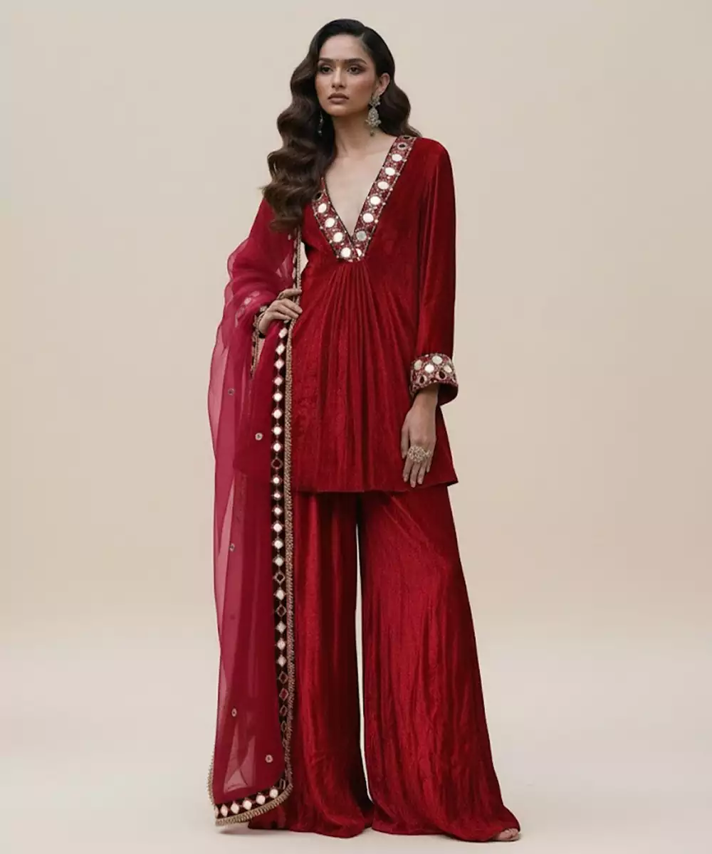 Stunning Maroon Embroidered Organza Sharara Set Crafted In A Lightweight, Sheer Fabric With A Delicate Sheen. Intricate Embroidery Adds Festive Elegance, While The Flared Sharara And Coordinated Top Create A Graceful, Stylish Silhouette. Perfect For Weddings, Festive Celebrations, And Evening Occasions.