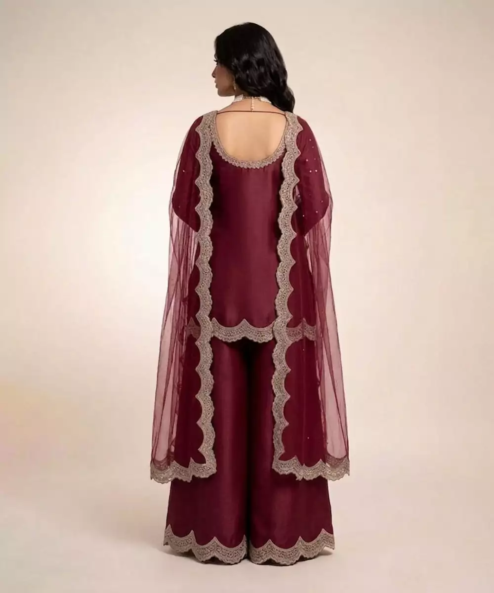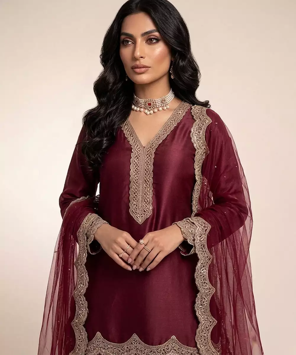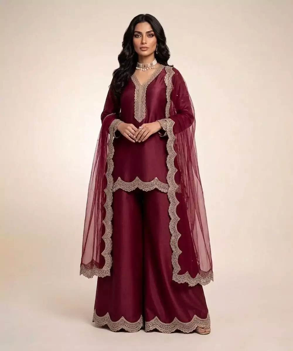 This Maroon Satin Sharara Set Showcases Exquisite Embroidery That Enhances Its Rich And Festive Appeal. The Luxurious Fabric Offers A Soft Sheen, While The Flared Sharara Adds Graceful Movement. Perfect For Weddings Or Celebrations, It Creates A Statement Look When Paired With Elegant Jewelry And Classic Footwear.