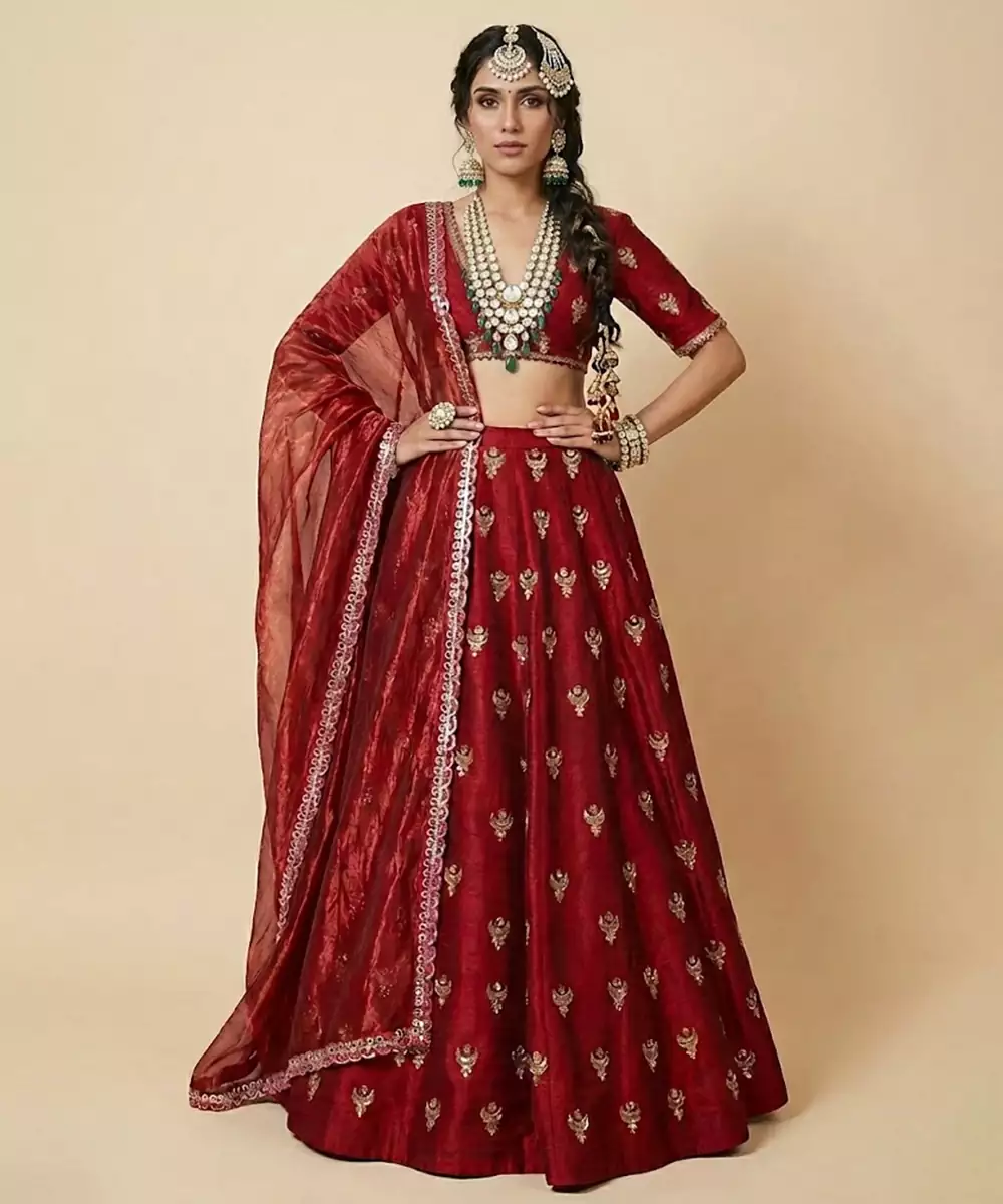 Elegant Maroon Embroidered Silk Lehenga Set Crafted In A Rich, Lustrous Fabric With A Graceful Drape. Intricate Embroidery Adds Traditional Charm And Festive Appeal, While The Flared Silhouette Enhances Its Regal Look. Perfect For Weddings, Festive Celebrations, Receptions, And Grand Traditional Occasions.