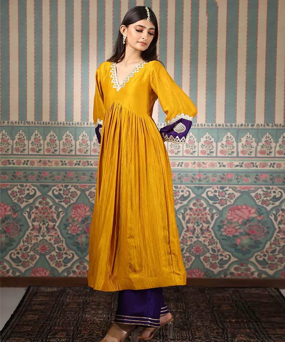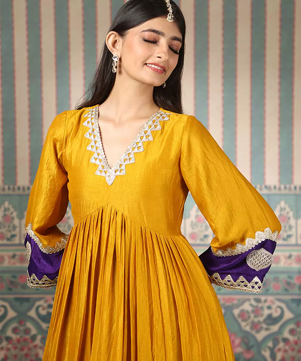 This Mustard Embroidered Silk Blend Kurta Set Reflects Graceful Elegance And Festive Charm. Crafted From A Luxurious Silk Blend Fabric, It Features Intricate Embroidery That Adds A Rich, Refined Touch. Ideal For Celebrations And Special Occasions, It Offers Comfort, A Flattering Silhouette, And Timeless Ethnic Appeal.