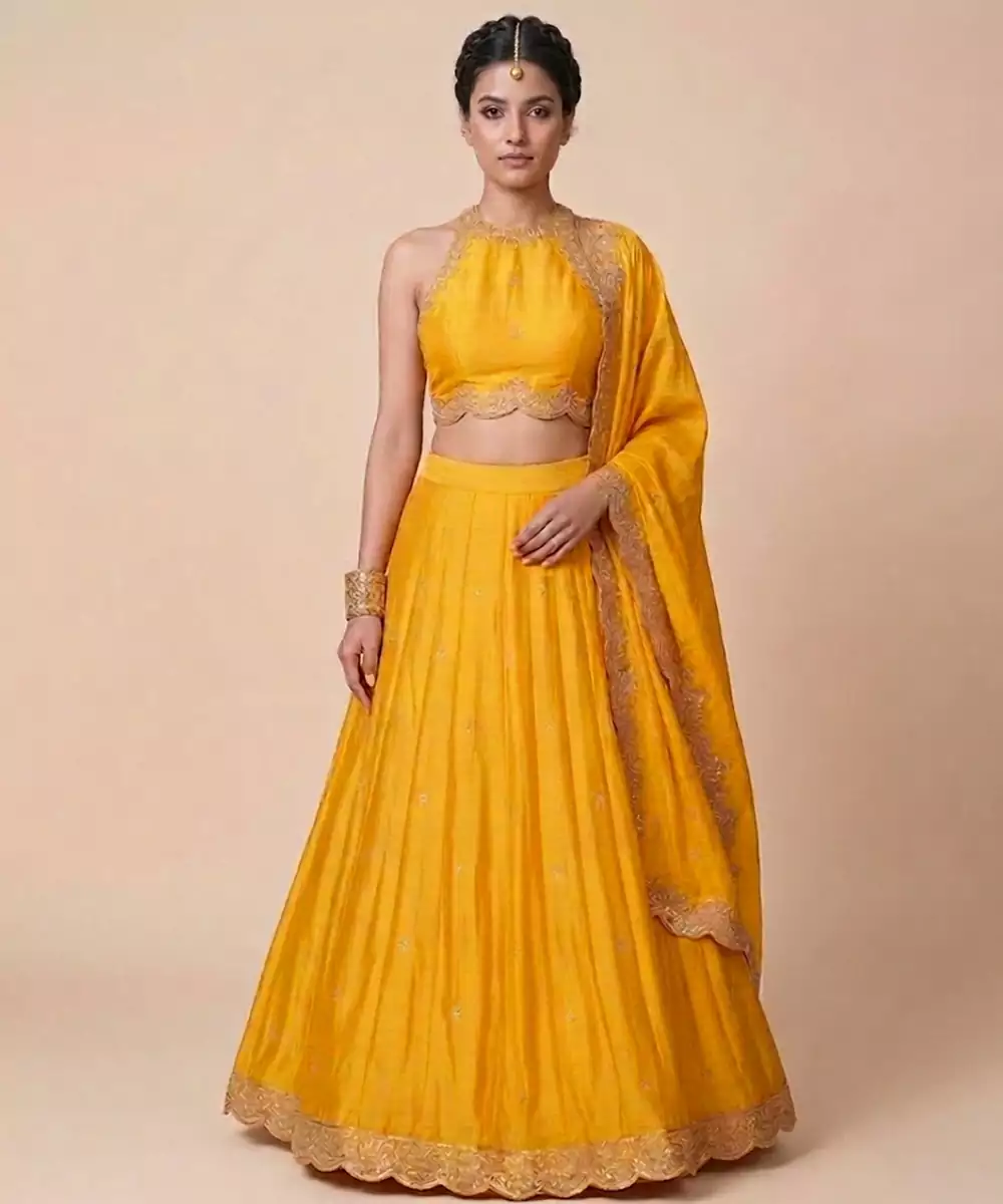 This Mustard Yellow Silk Lehenga Set Features Elegant Embroidery That Enhances Its Warm And Festive Charm. The Smooth Fabric Offers A Graceful Drape, Making It Perfect For Celebrations. Pair It With Traditional Accessories For A Vibrant And Timeless Look.