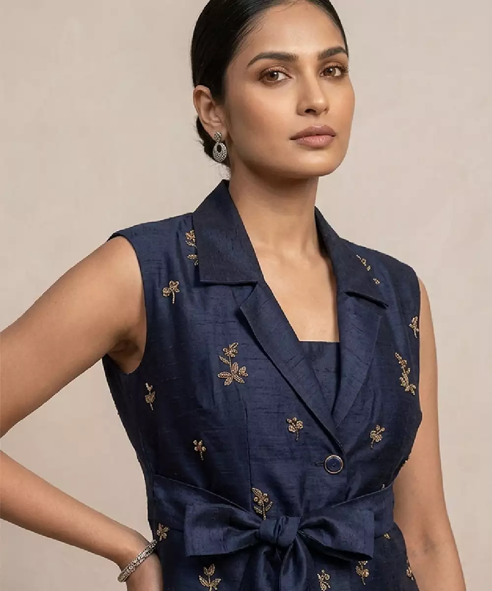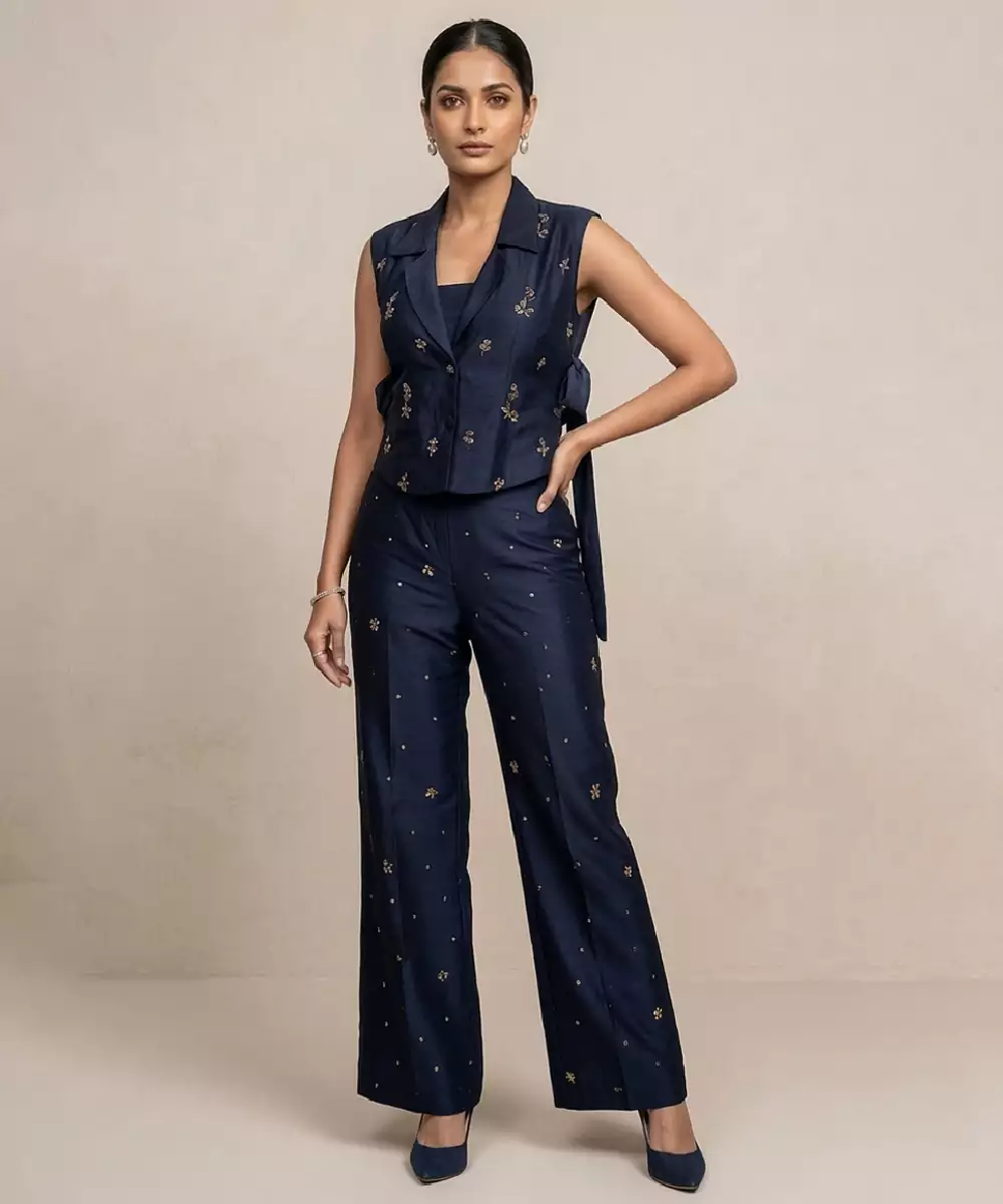 This Navy Blue Raw Silk Co Ord Set Features Traditional Block Prints That Add A Timeless And Artisanal Charm. The Rich Fabric Offers A Structured Yet Comfortable Fit, While The Elegant Silhouette Enhances Its Appeal. Perfect For Festive Gatherings Or Casual Occasions, It Pairs Beautifully With Minimal Accessories For A Refined Look.