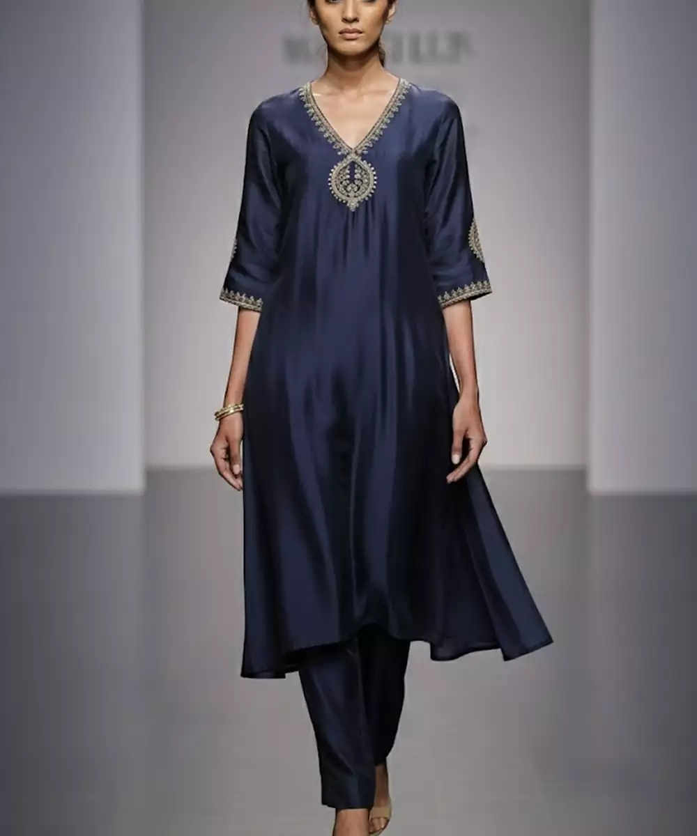 Navy Blue Chanderi Embroidered Kurta Set