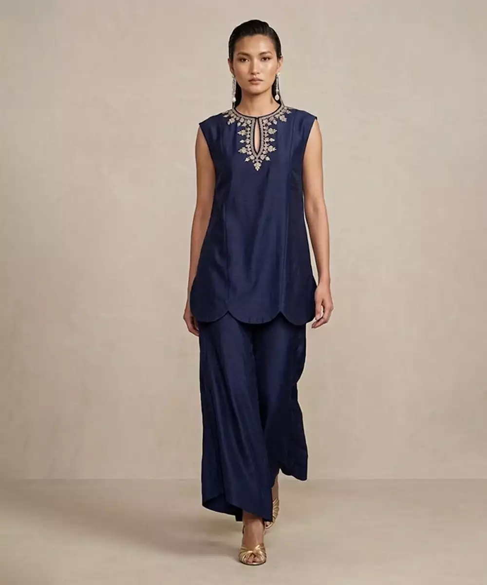 Crafted In Luxurious Raw Silk, This Navy Blue Co Ord Set Showcases Fine Embroidery That Enhances Its Sophisticated Appeal. The Structured Silhouette Offers A Flattering Fit While Ensuring Comfort. Ideal For Festive Gatherings Or Evening Events, It Pairs Effortlessly With Statement Accessories For A Timeless And Elegant Look.