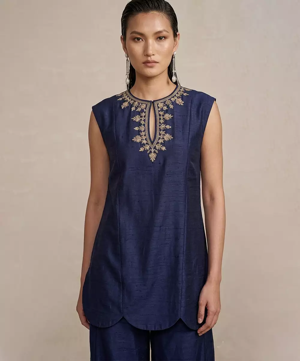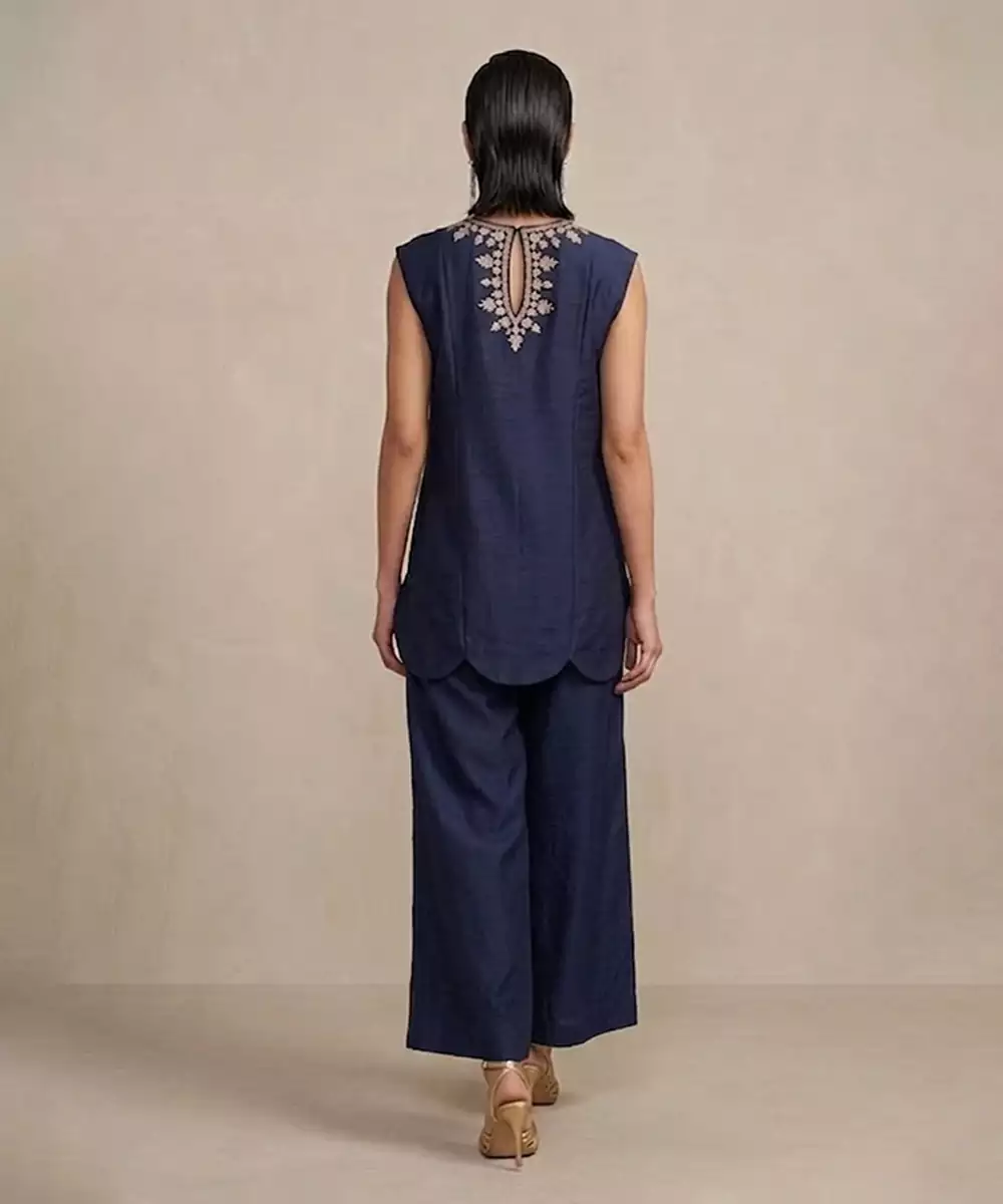 Navy Blue Embroidered Raw Silk Co Ord Set