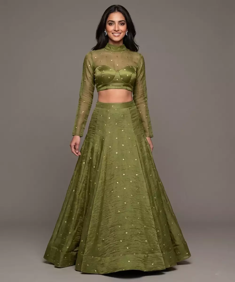This Olive Green Lehenga Set Showcases Elegant Embroidery That Enhances Its Understated Charm. The Fabric Offers A Graceful Drape, While The Silhouette Ensures Comfort And Style. Ideal For Festive Occasions, It Pairs Beautifully With Minimal Or Statement Accessories For A Refined And Contemporary Look.