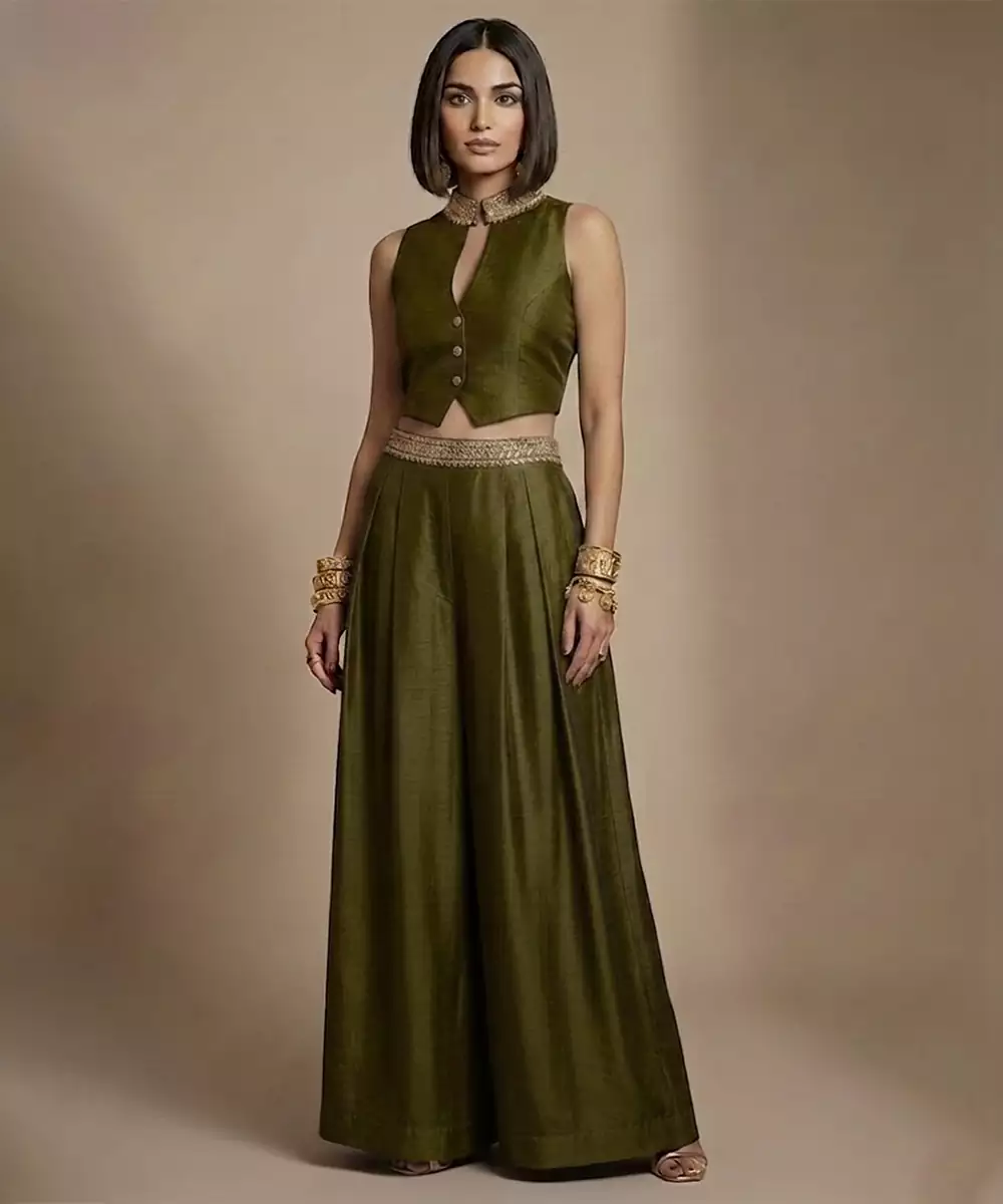 This Olive Green Embroidered Raw Silk Co Ord Set Features Earthy Tones With Delicate Craftsmanship. The Textured Fabric Enhances Its Premium Appeal, While The Elegant Silhouette Makes It Ideal For Festive Wear. A Refined Outfit That Combines Comfort With Understated Sophistication Beautifully.
