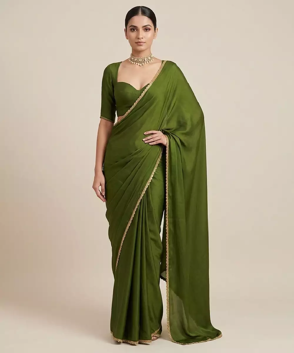 This Olive Green Mul Cotton Saree Set Features Delicate Lace Detailing That Enhances Its Soft And Elegant Appeal. The Breathable Fabric Ensures All Day Comfort, While The Lightweight Drape Adds Effortless Grace. Perfect For Casual Outings Or Daytime Events, It Pairs Beautifully With Minimal Accessories For A Refined And Understated Look.