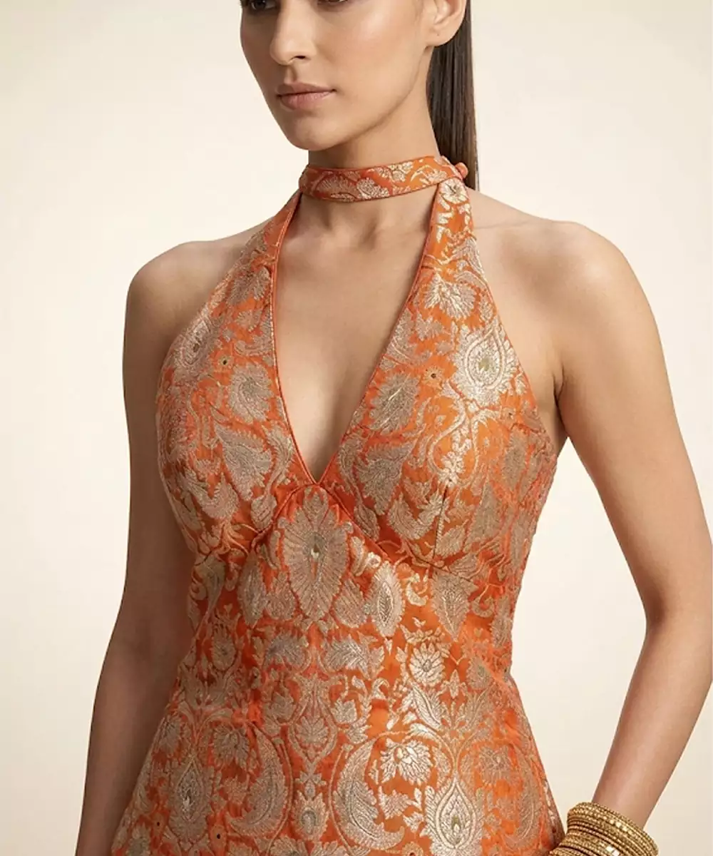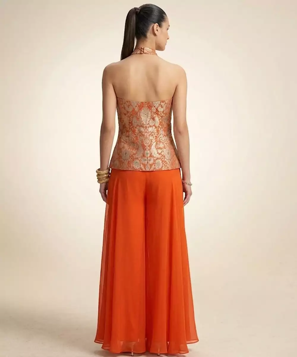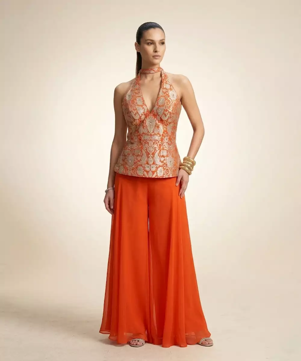 A Stylish Orange Embroidered Crepe Co Ord Set That Combines Lightweight Comfort With Elegant Detailing. The Soft Crepe Fabric Drapes Beautifully, While The Embroidery Enhances Its Appeal. Perfect For Both Casual Celebrations And Semi Formal Events With A Chic And Modern Look.