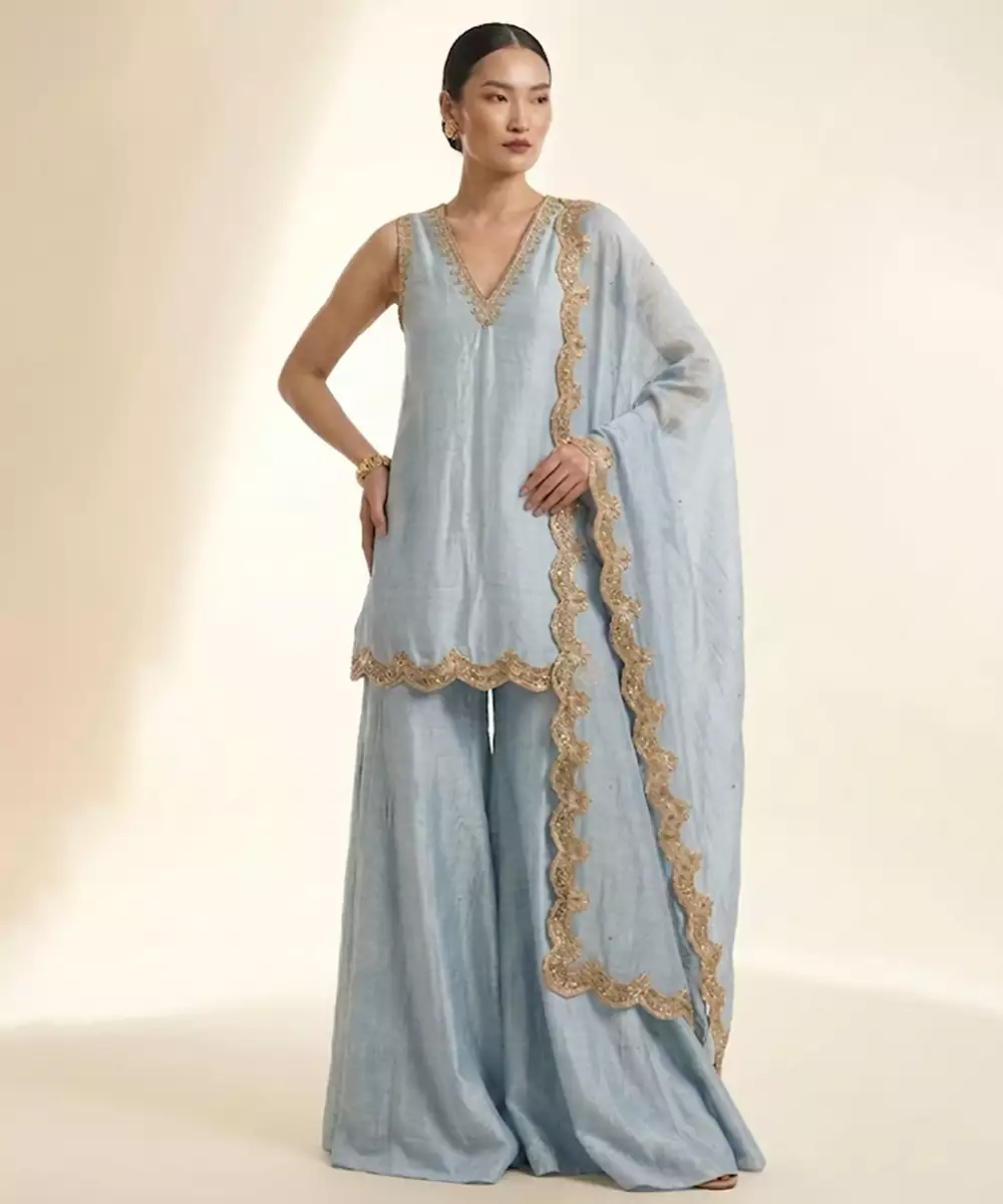 This Pastel Blue Embroidered Silk Sharara Set Features A Calm Tone With Delicate Craftsmanship. The Flared Design Adds Elegance And Movement, Making It Perfect For Festive Occasions. A Refined Ensemble That Blends Tradition With Modern Aesthetics Beautifully.