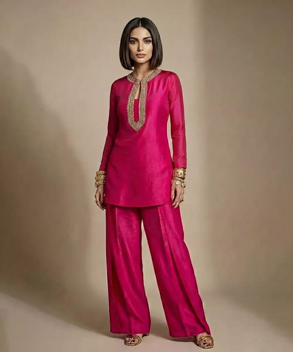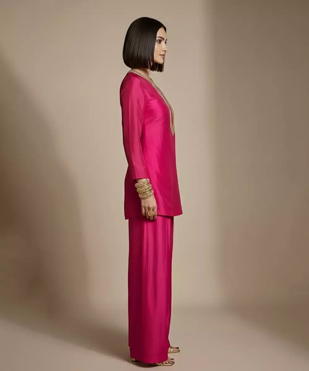 A Charming Pink Co Ord Set Crafted In Rich Raw Silk, Highlighted With Delicate Embroidery That Adds A Festive Yet Graceful Touch. The Soft Sheen Of The Fabric Enhances Its Elegance, Making It Ideal For Daytime Celebrations, Intimate Gatherings, And Cultural Events With Effortless Sophistication.