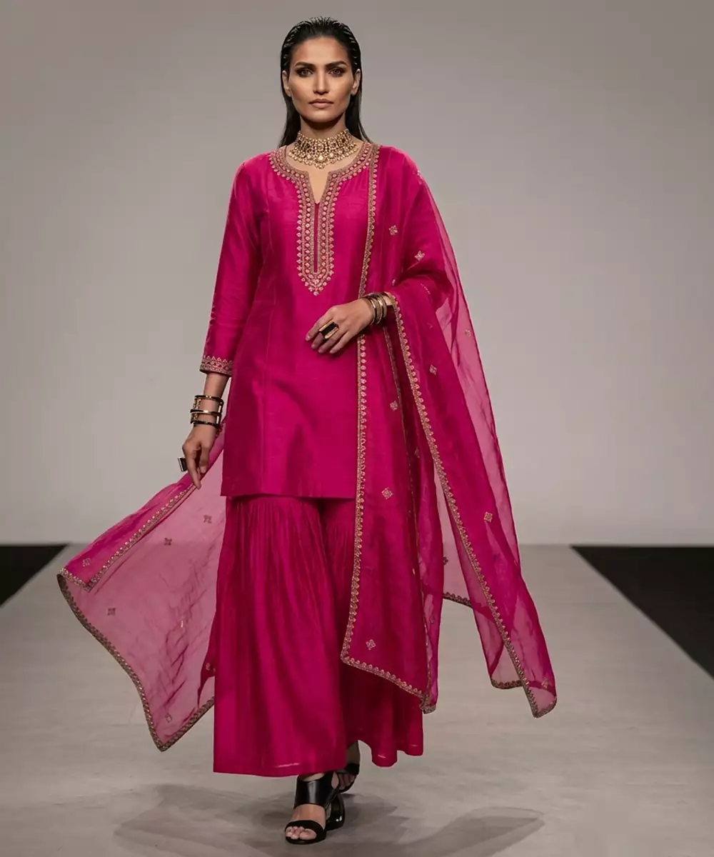 Pink Embroidered Raw Silk Sharara Set