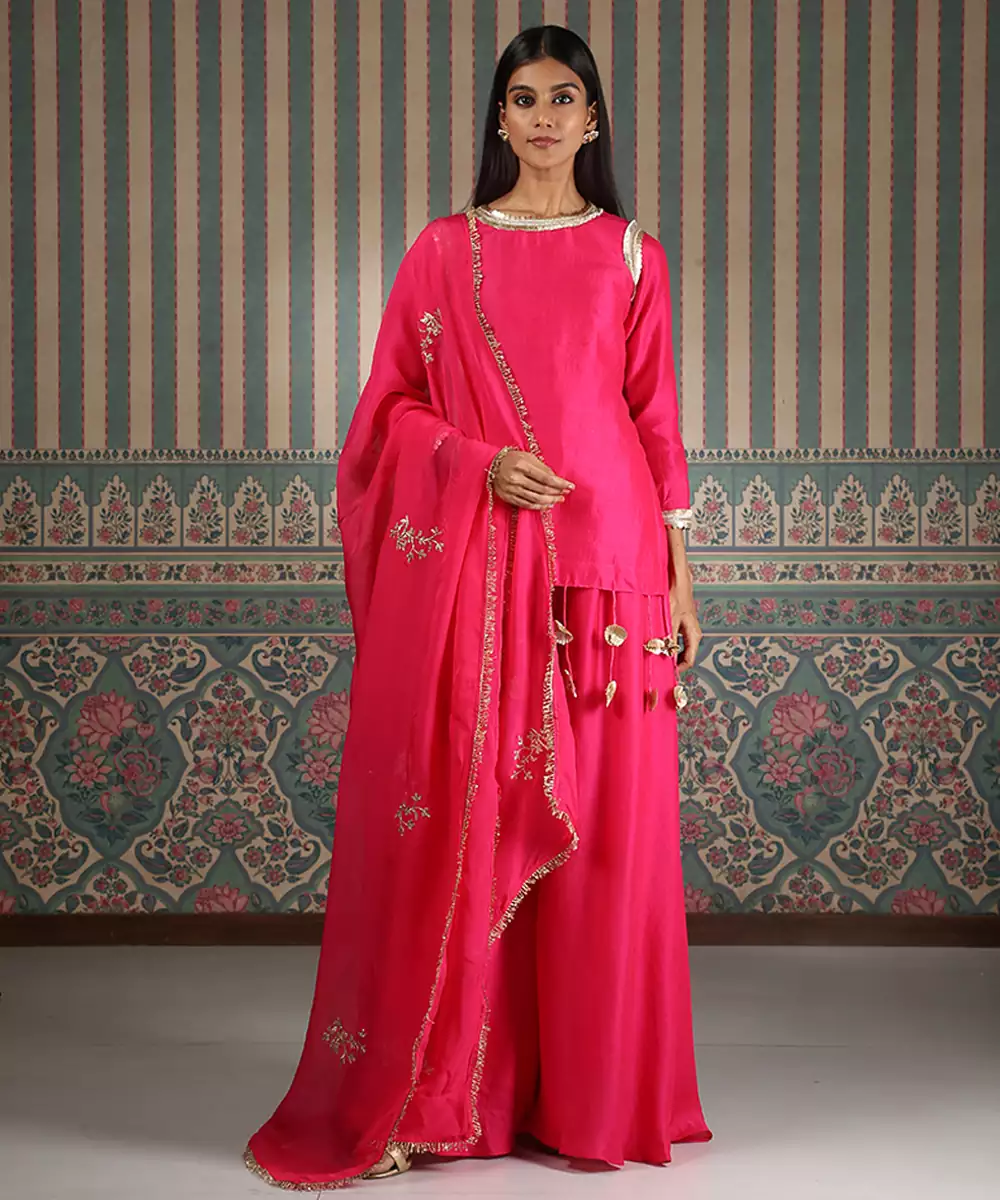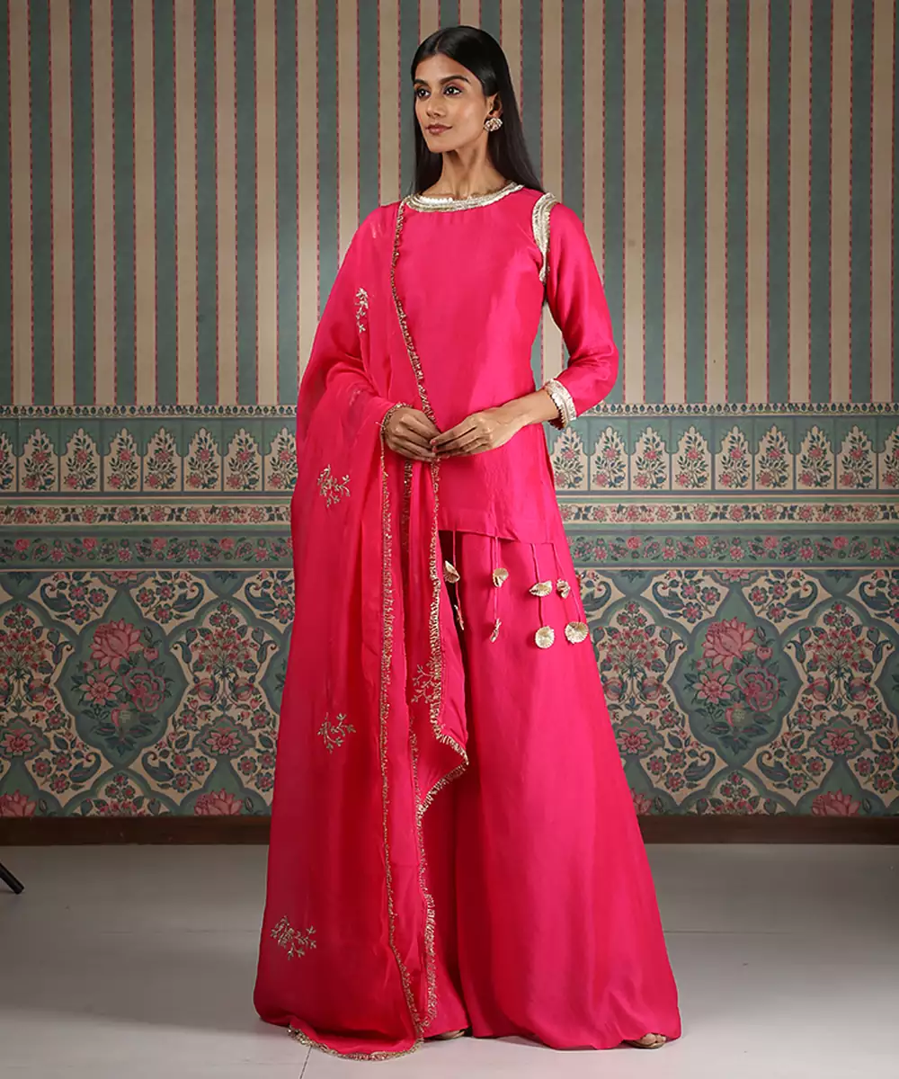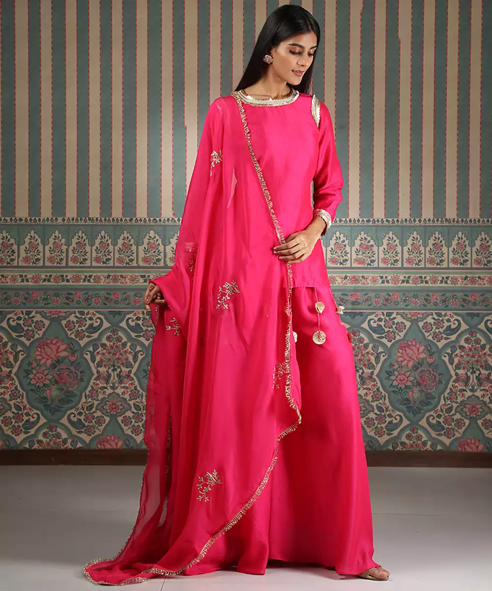 This Pink Embroidered Silk Blend Sharara Set Exudes Vibrant Elegance And Festive Charm. Crafted From A Luxurious Silk Blend Fabric, It Features Intricate Embroidery That Adds A Rich, Refined Touch. Perfect For Weddings And Celebrations, It Offers A Graceful Silhouette, Comfortable Fit, And Timeless Ethnic Appeal.