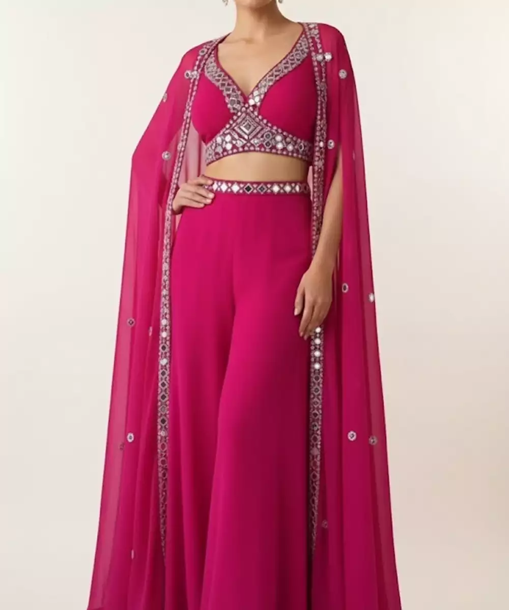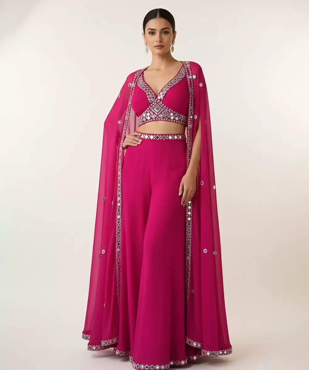 "A Feminine Pink Georgette Co Ord Set Adorned With Fine Embroidery For A Graceful Finish. The Lightweight Fabric Offers Comfort And Flow. Ideal For Festive Gatherings And Daytime Celebrations.