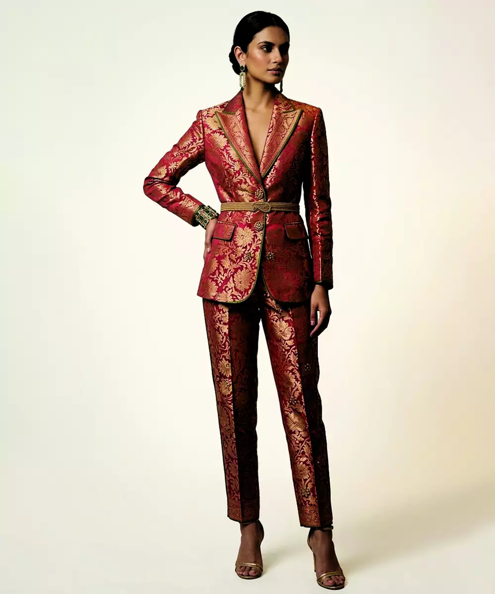 A Beautifully Designed Pink Woven Brocade Co Ord Set Featuring Intricate Patterns And A Rich Texture. The Luxurious Fabric Gives It A Regal Touch, Making It Perfect For Festive Occasions, Weddings, Or Celebrations. Its Coordinated Silhouette Ensures A Graceful And Standout Appearance.