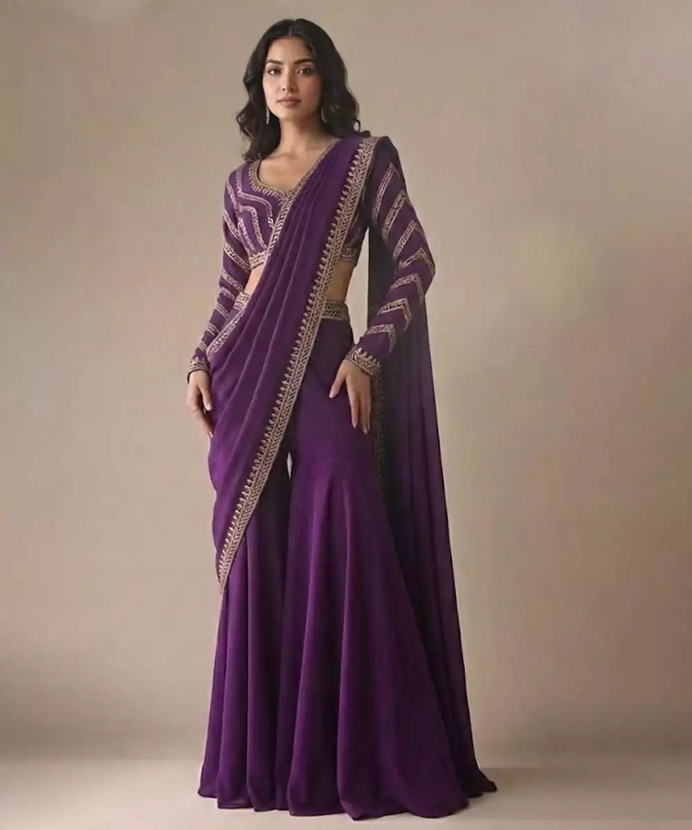 Elegant Purple Embroidered Satin Sharara Set Crafted In A Smooth, Lustrous Fabric With A Luxurious Feel. Intricate Embroidery Adds Festive Charm, While The Flared Sharara And Coordinated Top Create A Graceful, Stylish Silhouette. Perfect For Weddings, Festive Celebrations, Evening Events, And Traditional Occasions.