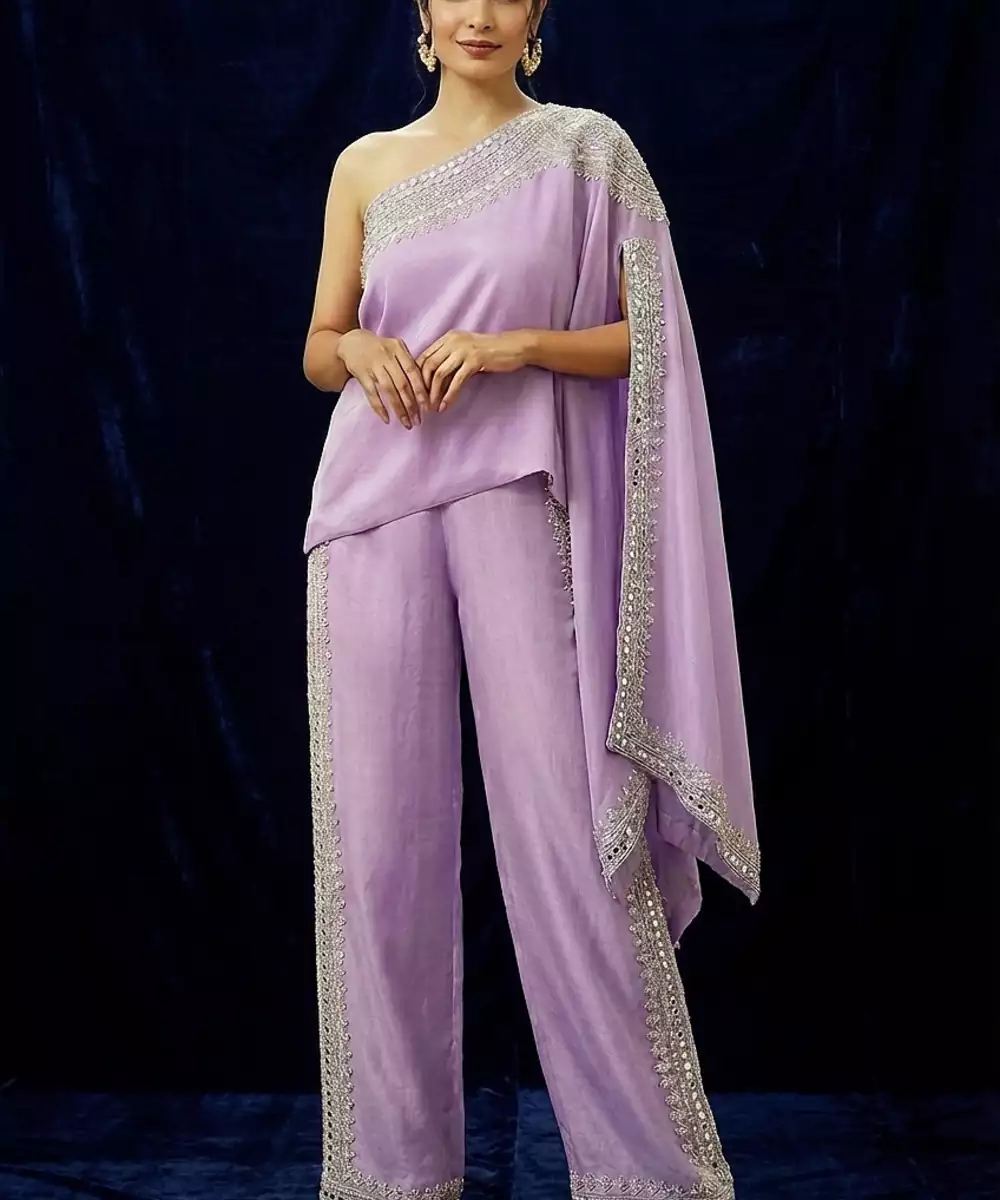 Purple Embroidered Silk Co Ord Set Crafted With A Rich, Lustrous Finish And Elegant Drape. Adorned With Intricate Embroidery That Enhances Its Regal Appeal. Designed For Comfort And Style, This Ensemble Is Perfect For Festive Occasions, Celebrations, And Evening Events, Offering A Refined Blend Of Traditional Charm And Modern Sophistication.