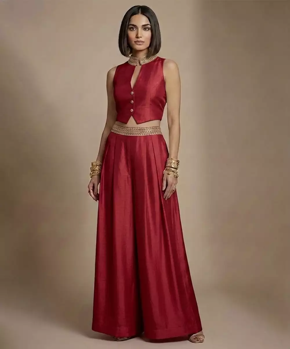 This Red Embroidered Raw Silk Co Ord Set Features Bold Color With Intricate Craftsmanship. The Luxurious Fabric Enhances Its Festive Appeal, Making It Perfect For Weddings And Celebrations. A Striking Ensemble That Embodies Tradition, Elegance, And Modern Sophistication.