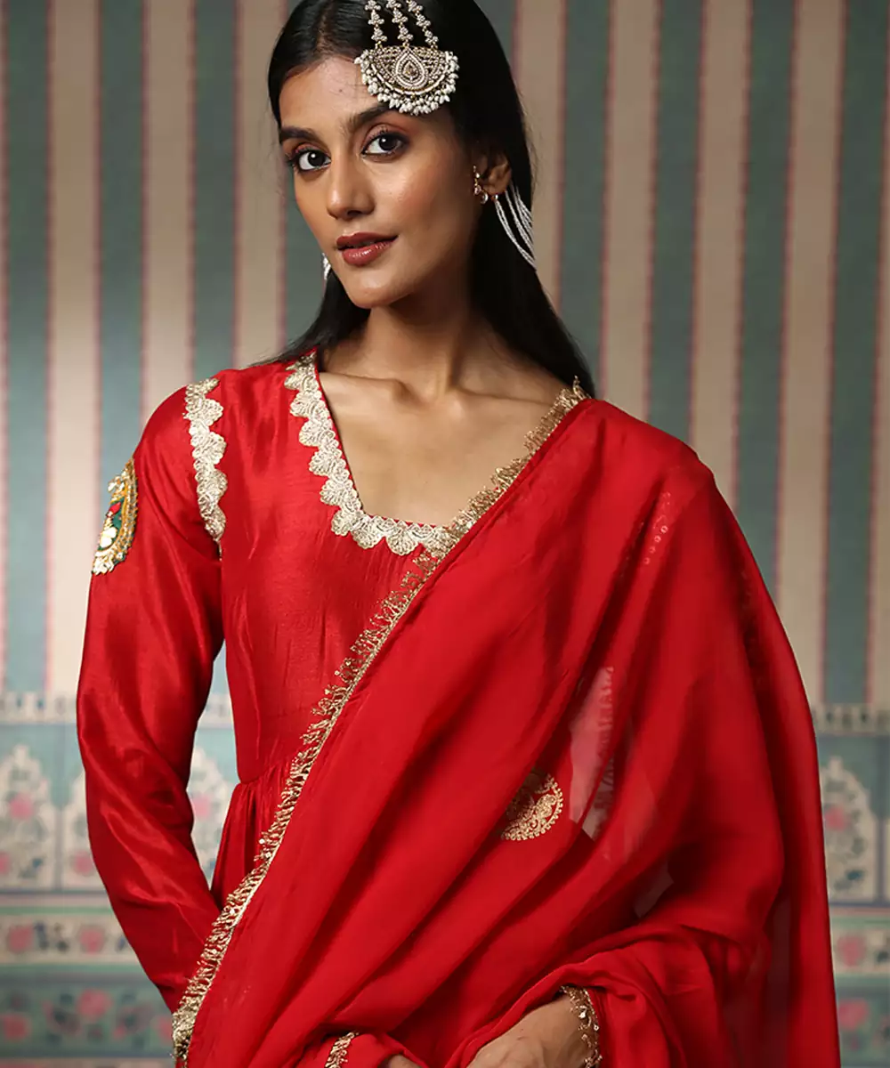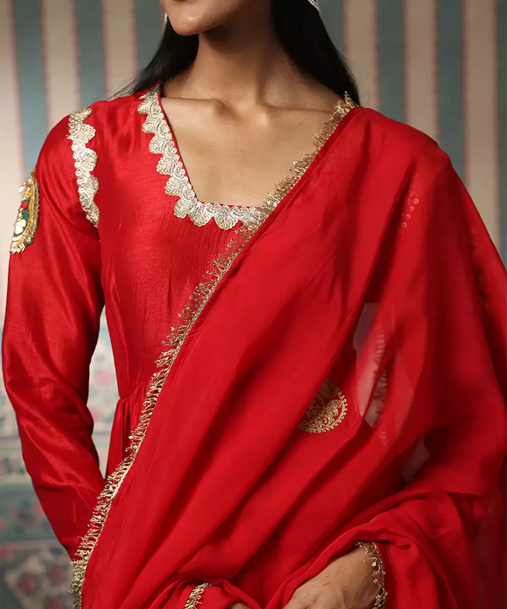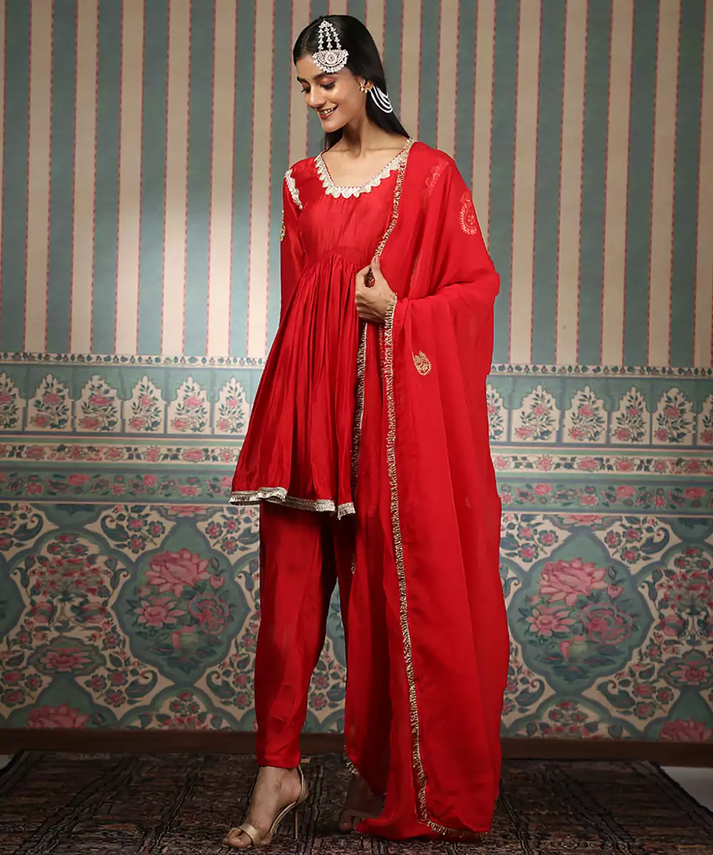 This Red Embroidered Silk Blend Kurta Set Reflects Graceful Elegance And Festive Charm. Crafted From A Luxurious Silk Blend Fabric, It Features Intricate Embroidery That Adds A Rich, Refined Touch. Ideal For Celebrations And Special Occasions, It Offers Comfort, A Flattering Silhouette, And Timeless Ethnic Appeal.