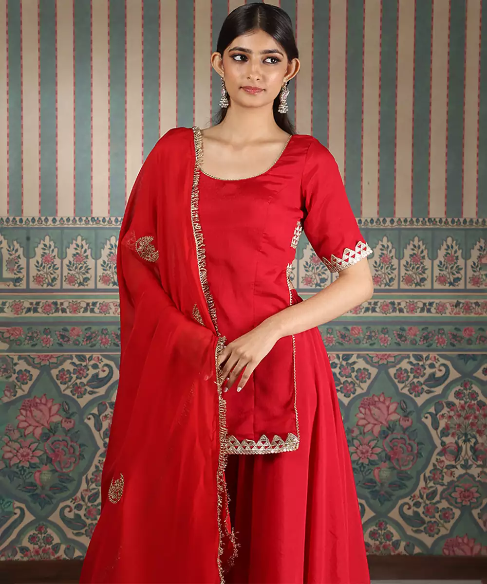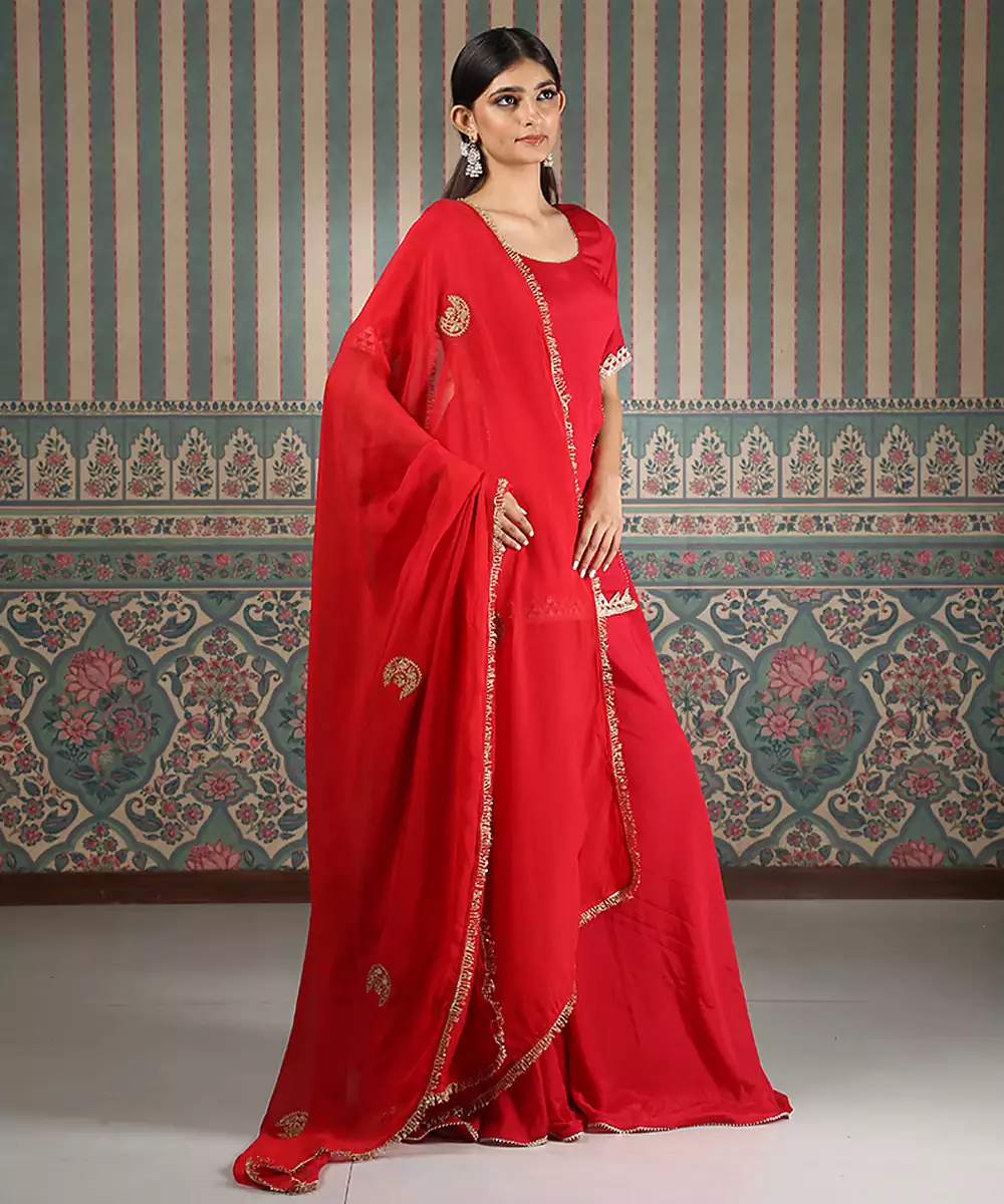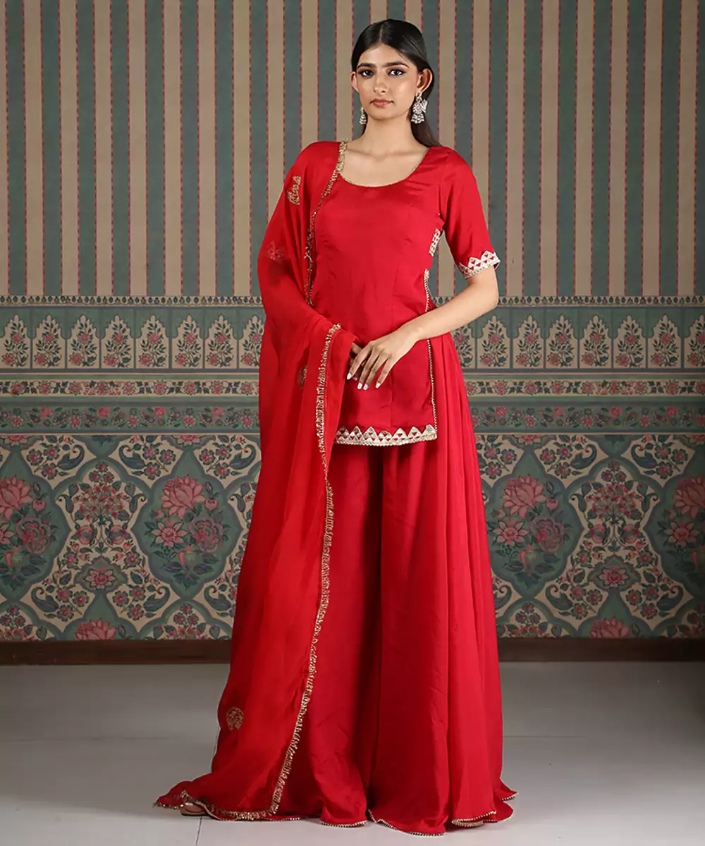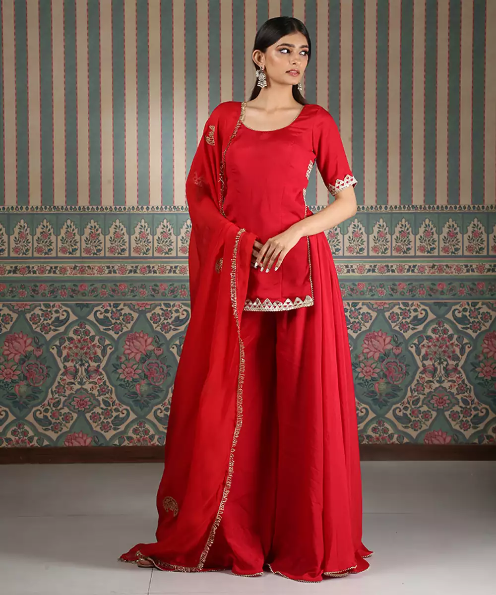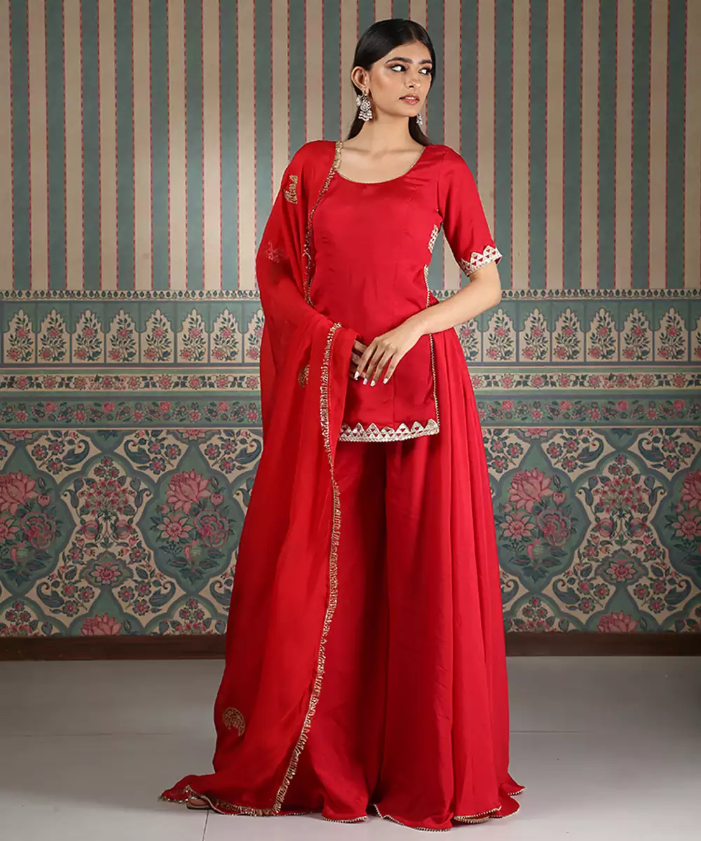 This Red Embroidered Silk Blend Sharara Set Exudes Vibrant Elegance And Festive Charm. Crafted From A Luxurious Silk Blend Fabric, It Features Intricate Embroidery That Adds A Rich, Refined Touch. Perfect For Weddings And Celebrations, It Offers A Graceful Silhouette, Comfortable Fit, And Timeless Ethnic Appeal.