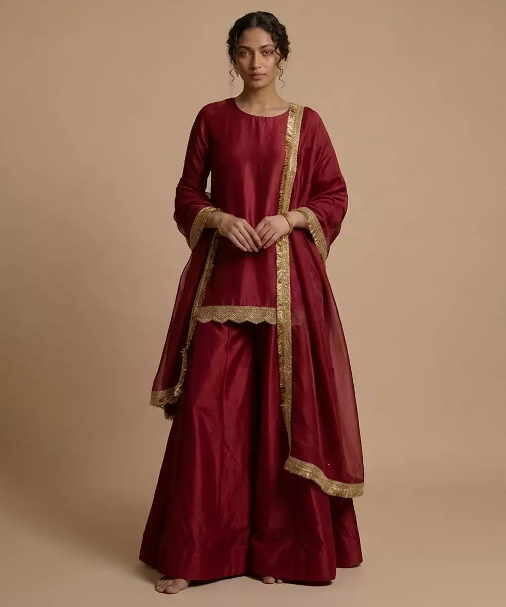 This Red Silk Sharara Set Features Detailed Embroidery That Enhances Its Festive And Vibrant Appeal. The Rich Fabric Offers A Graceful Drape, While The Flared Sharara Adds Movement And Elegance. Perfect For Celebrations, It Pairs Beautifully With Traditional Jewelry For A Timeless Look.