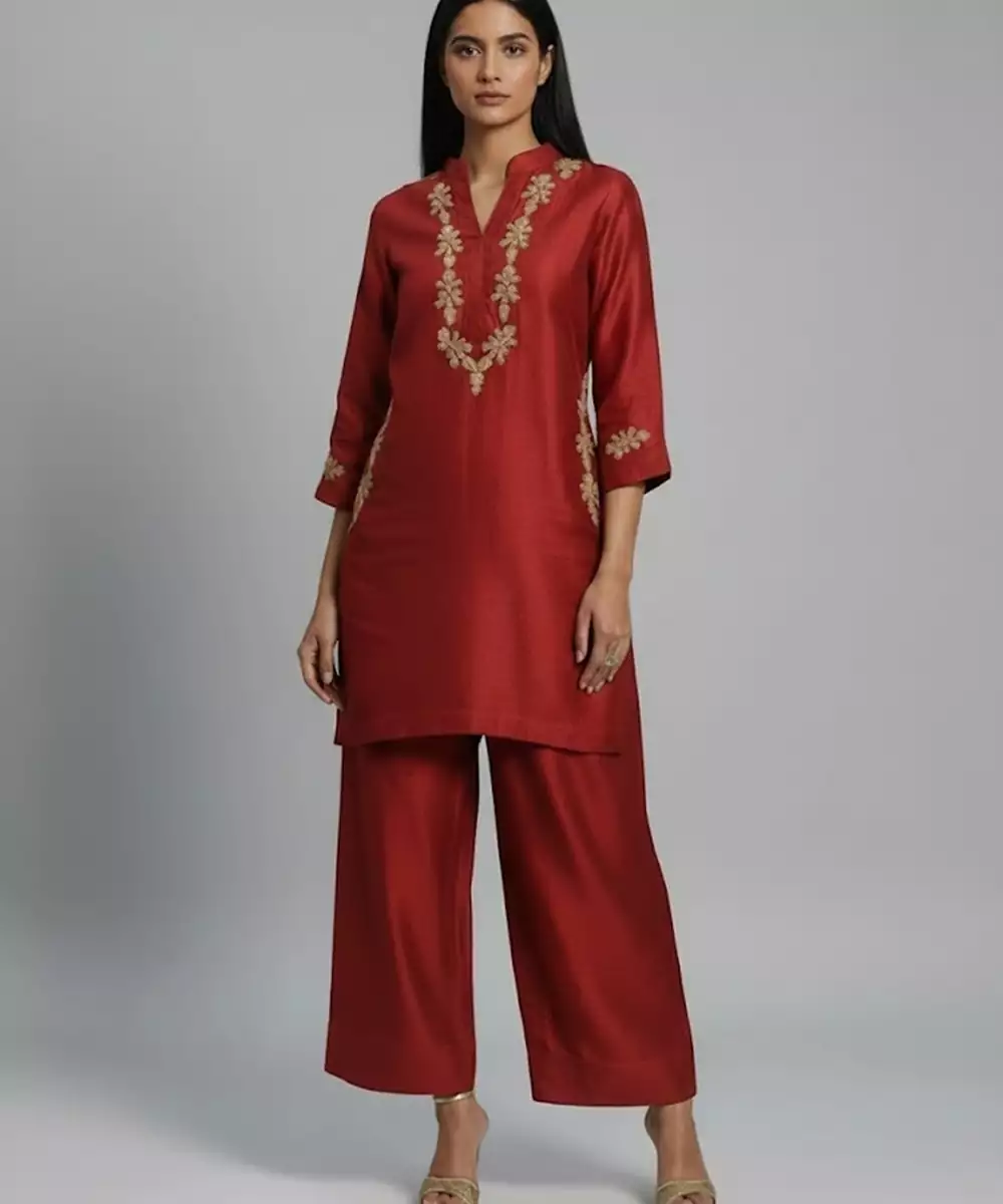 Red Silk Embroidered Kurta Set