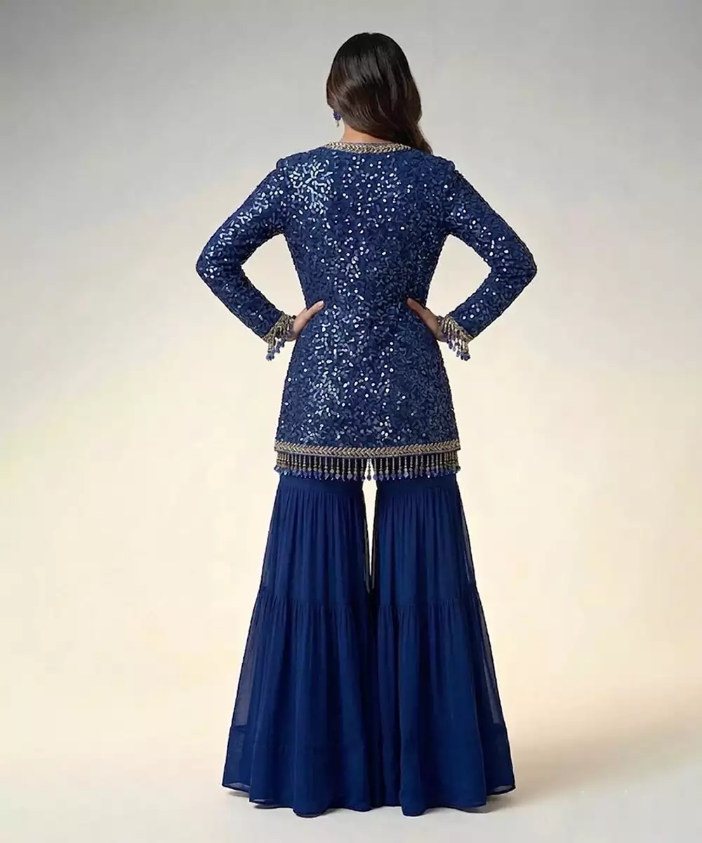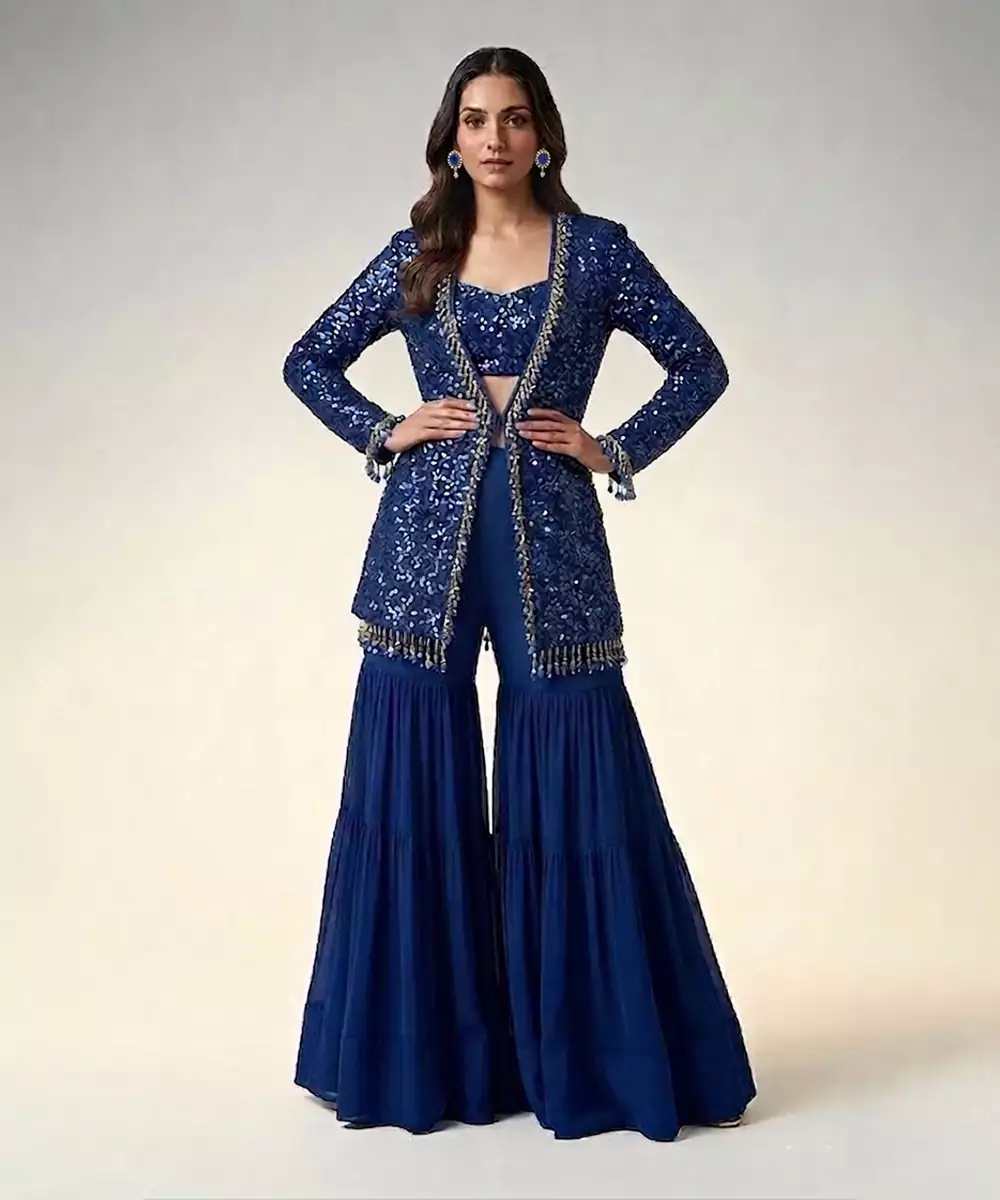 Royal Blue Embroidered Georgette Indowestern Sharara Set