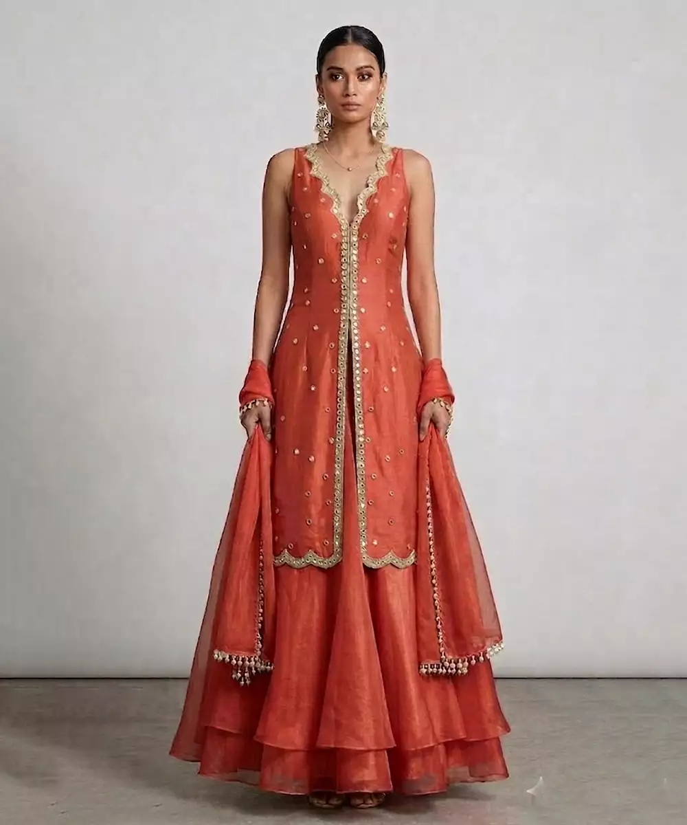 This Rust Orange Organza Sharara Set Showcases Delicate Embroidery That Adds Warmth And Festive Charm. The Lightweight Fabric Offers A Soft, Airy Drape, While The Flared Sharara Enhances Its Graceful Appeal. Ideal For Celebrations, It Pairs Effortlessly With Traditional Accessories For A Vibrant And Elegant Ensemble.
