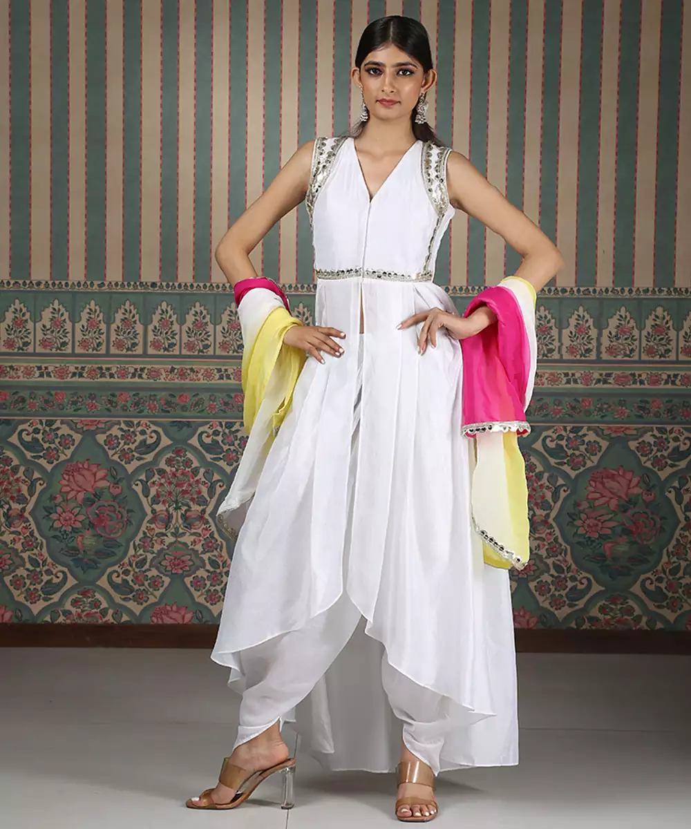 This White Embroidered Silk Blend Kurta Set Reflects Graceful Elegance And Festive Charm. Crafted From A Luxurious Silk Blend Fabric, It Features Intricate Embroidery That Adds A Rich, Refined Touch. Ideal For Celebrations And Special Occasions, It Offers Comfort, A Flattering Silhouette, And Timeless Ethnic Appeal.