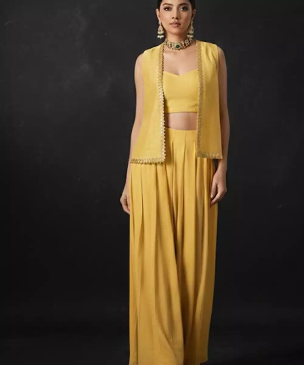 Fresh Yellow Crepe Paired With Refined Embroidery Creates A Bright Yet Elegant Co Ord Set. The Airy Fabric Ensures Comfort, While The Silhouette Remains Sleek And Festive. Perfect For Daytime Functions And Cheerful Celebrations.