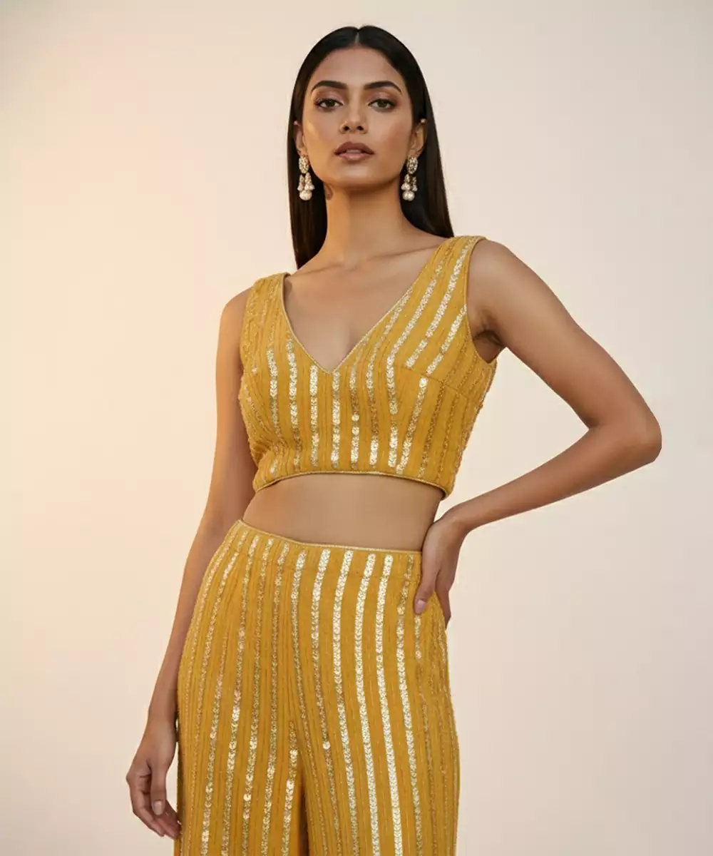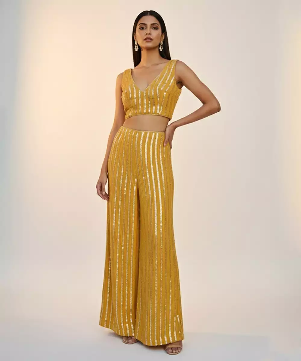 Bright Yellow Georgette Brings Lightness And Elegance To This Embroidered Co Ord Set. The Breezy Fabric Ensures Comfort, While The Detailing Adds Festive Appeal. Ideal For Daytime Events And Joyful Celebrations.