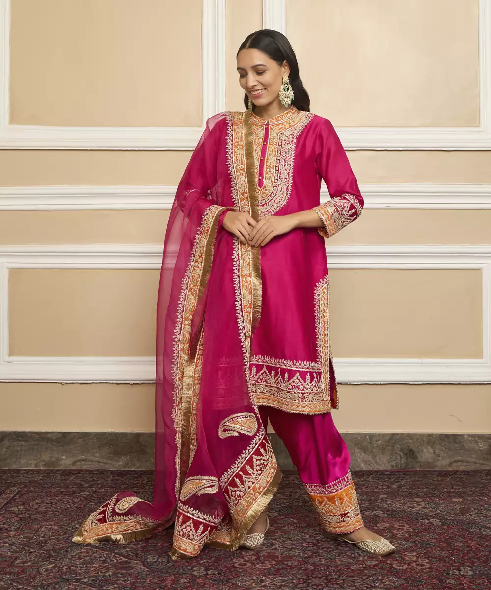 This Ensemble Is Made In Pure Silk Chanderi Fabric And Adorned With Heritage Kashmiri Tilla Embroidery. It Features A Collar With Placket, Three Quarter Bell Sleeves. The Salwar Will Have An Embroidery Border At Hem. The Whole Ensemble Is Highlighted With Appliqué, Gota And Is Finished Using A Chanderi Silk Banarsi Fabric And Gota. The Dupatta Is Finished Is Finished With Kinari.