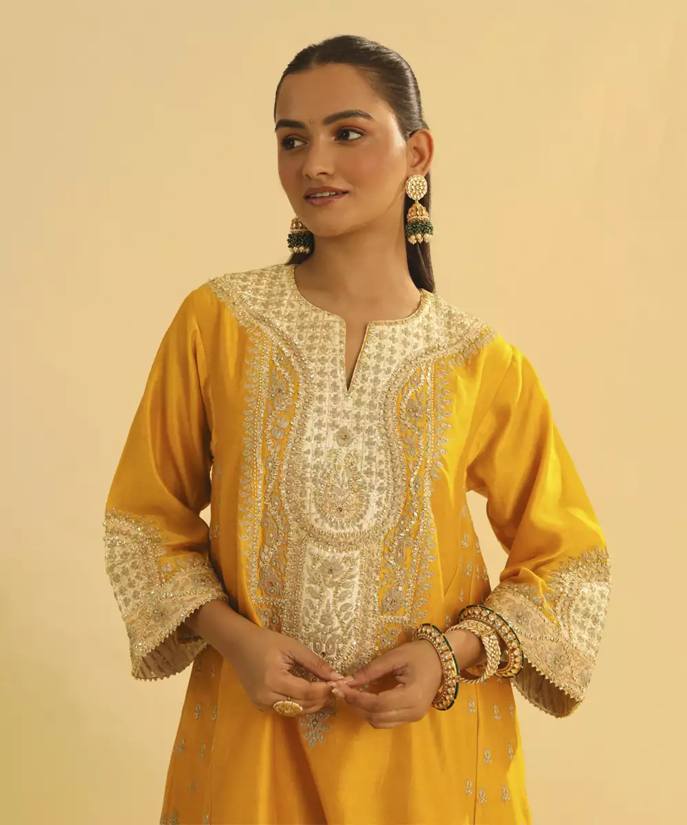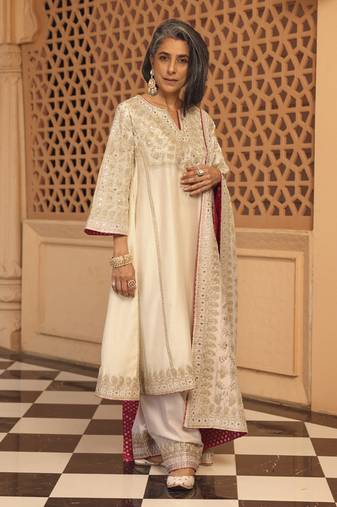 The Arisana Ensemble, Crafted From Luxurious Silk Chanderi, Features Our Signature Heritage Kashmiri Tilla Embroidery. It Is Meticulously Adorned With Appliqué, Gota And Kundan Work. The Chauga Features A Closed Neck With A Slit And Is Paired With A Salwar. It Makes Use Of Chanderi Silk Banarsi Fabric For The Final Touch.