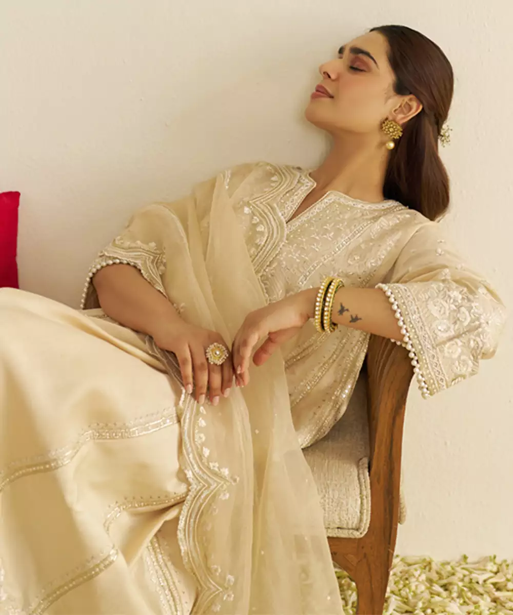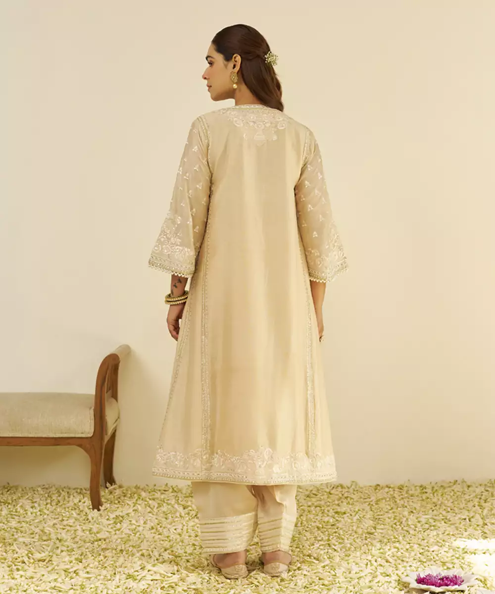 Beige Maaroofa Long Chauga With Salwar Kurta Chanderi Silk; Bottom Bamberg Satin 1 Chauga / 1 Salwar