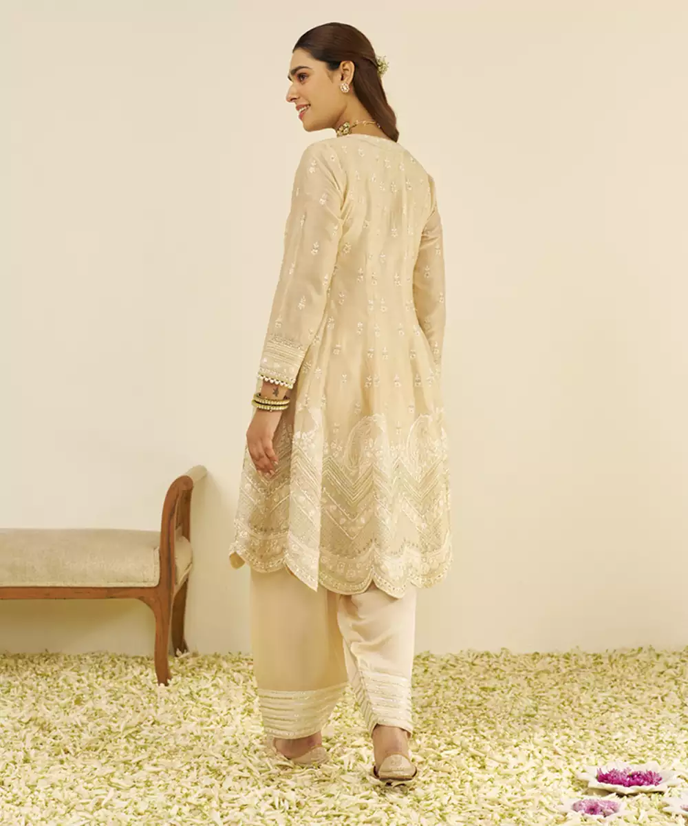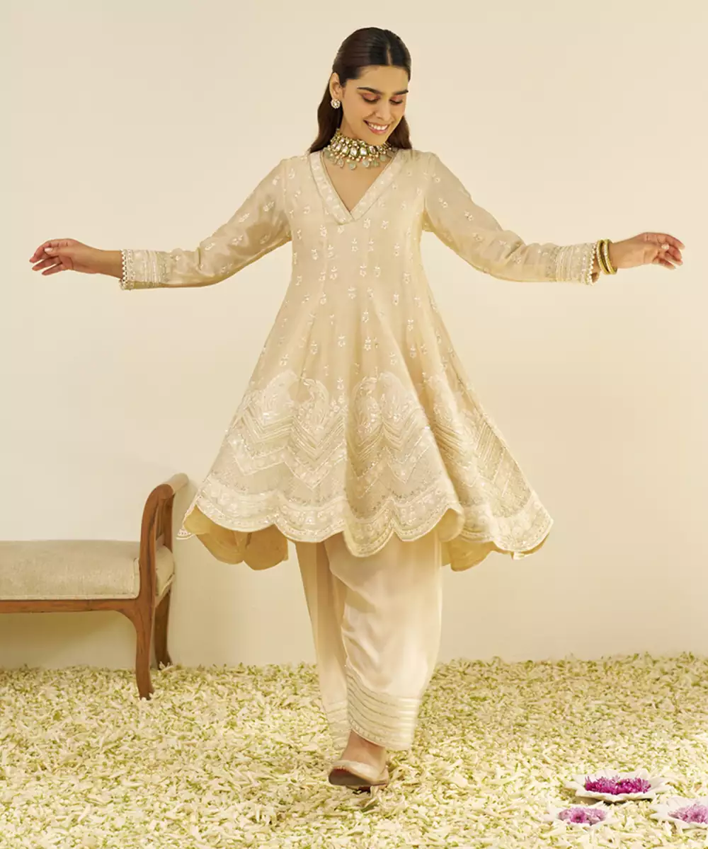 Beige Meeram Short Anarkali With Salwar And Dupatta Kurta Chanderi Silk; Bottom Bamberg Satin; Dupatta Silk Organza 1 Anarkali / 1 Salwar / 1 Dupatta