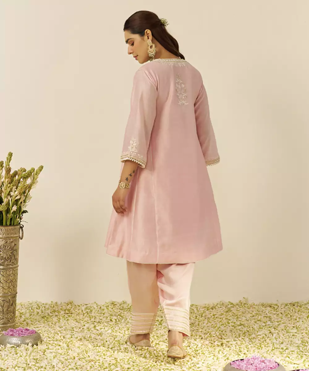 Blush Pink Aiza Short Chauga With Salwar And Dupatta Kurta Chanderi Silk; Bottom Bamberg Satin; Dupatta Silk Organza 1 Chauga / 1 Salwar / 1 Dupatta